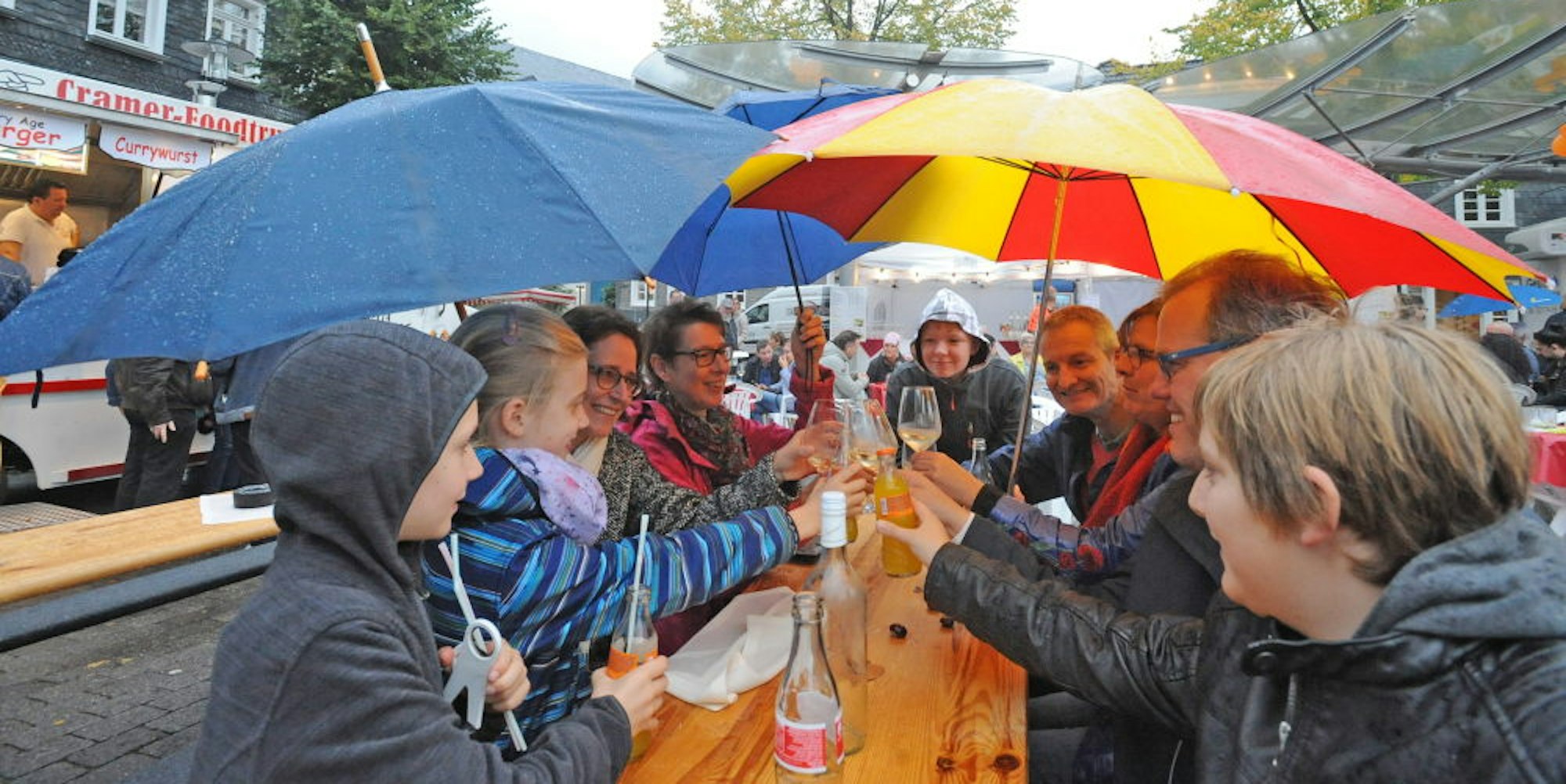 Unter bunten Schirmen trotzten die Burscheider beim Kulinarischen Wochenende den Wetterkapriolen.
