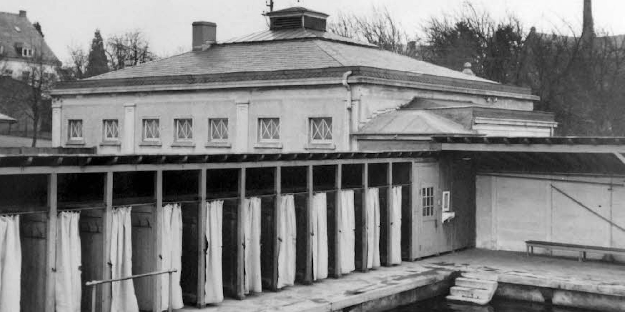 Das Bassin und die Umkleidekabinen auf einer historischem Aufnahme zeigen das Bad in den Anfangsjahren.