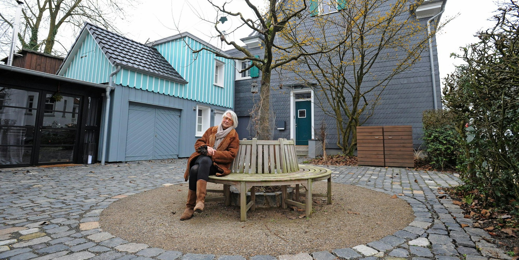 Die Architektin Jelle von Dryander auf der Bank in ihrem Hof, der Spazierende zum Anhalten einlädt.