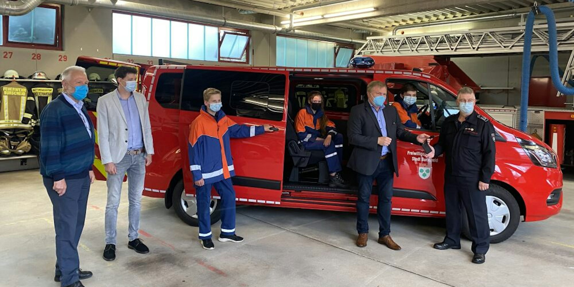 Nun übergaben Roman Fietz vom Autozulieferer Fietz, Bürgermeister Stefan Caplan und Amtsleiter Holger Wilke gemeinsam den Fahrzeugschlüssel an das Leitungsteam der Freiwillige Feuerwehr Burscheid mit Wehrleiter Achim Lütz. Das neue Fahrzeug ist hauptsächlich für den Feuerwehrnachwuchs vorgesehen und ersetzt ein mittlerweile außer Dienst gestelltes Mannschaftstransport-Fahrzeug aus dem Baujahr 2002. Laut Feuerwehr diente es dem Personentransport bei Einsätzen und zum Besuch von Aus- und Fortbildungsveranstaltungen.
