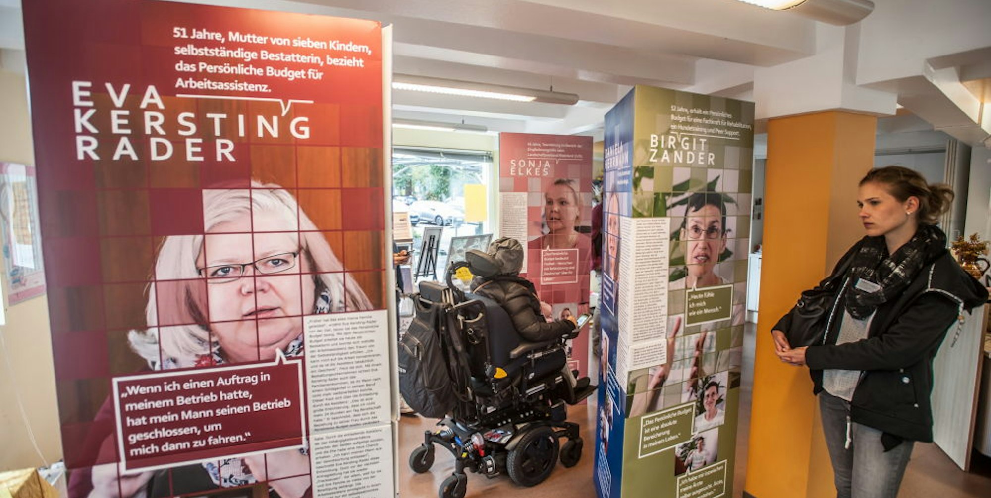 Ziel ist es, die Chancen des „Persönlichen Budgets“ herüberzubringen, zu informieren und Mut zu machen, einen Antrag zu stellen. Ute Gagaridis vom Beirat Inklusion hat vor vielen Jahren die Erfahrung gemacht, dass die behördlichen Hürden hoch sind. Doch offenbar ändert sich das auch vor dem Hintergrund der Neugestaltung des Bundesteilhabegesetzes (BTHG). „Jetzt wird es interessant“, sagte auch Anne Stegert von der Kette in Hilgen. Die stationäre Wohneinrichtung für psychisch behinderte Menschen versuchte bereits vor einigen Jahren, das Budget an Bewohner zu vermitteln. Funktioniert hat es nicht. Der Bekanntheitsgrad ist gering, das war für Corts und Gagaridis auch der Grund, durch die Ausstellung aufmerksam zu machen. Bei der Eröffnung sprach Ellen Marquardt aus der Kölner Beratungsstelle des Kompetenzzentrums Selbstbestimmtes Leben über ihre Erfahrungen. Es gebe viele Berührungsängste. Das persönliche Budget biete jedoch die Möglichkeit, selbst als Kunde aufzutreten und zu sagen, welche Leistungen erbracht werden sollen.