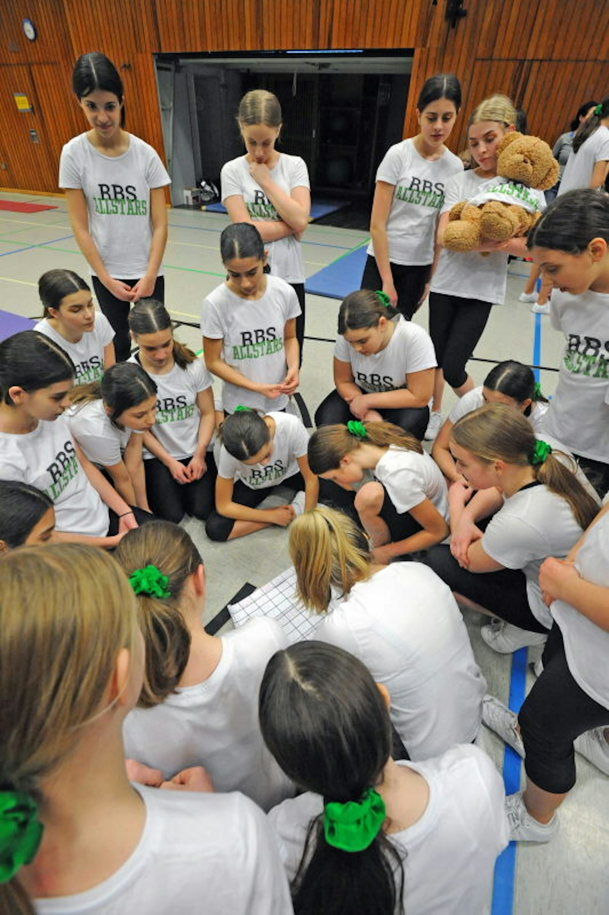 Teambesprechung mit dem Teddymaskottchen. Die Allstars hatten Generalprobe in der Hans-Hoersch-Halle.