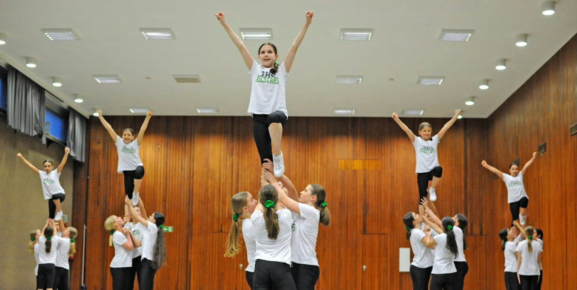 Burscheid – Sie trainieren in jeder freien Minute, bilden Pyramiden, tanzen ihre Formationen in Windeseile und mit akrobatischer Kunst, sind quirlig und gut drauf. Die RBS Allstars stehen zum allersten Mal als Cheerleader auf der Matte. Trainerin Giovanna Lombardo arbeitet mit 24 Mädchen und jungen Frauen im Alter zwischen zehn und 15 Jahren seit September an einer rasanten Choreografie, die in zweieinhalb Minuten ein dynamisches Feuerwerk offenbart.
