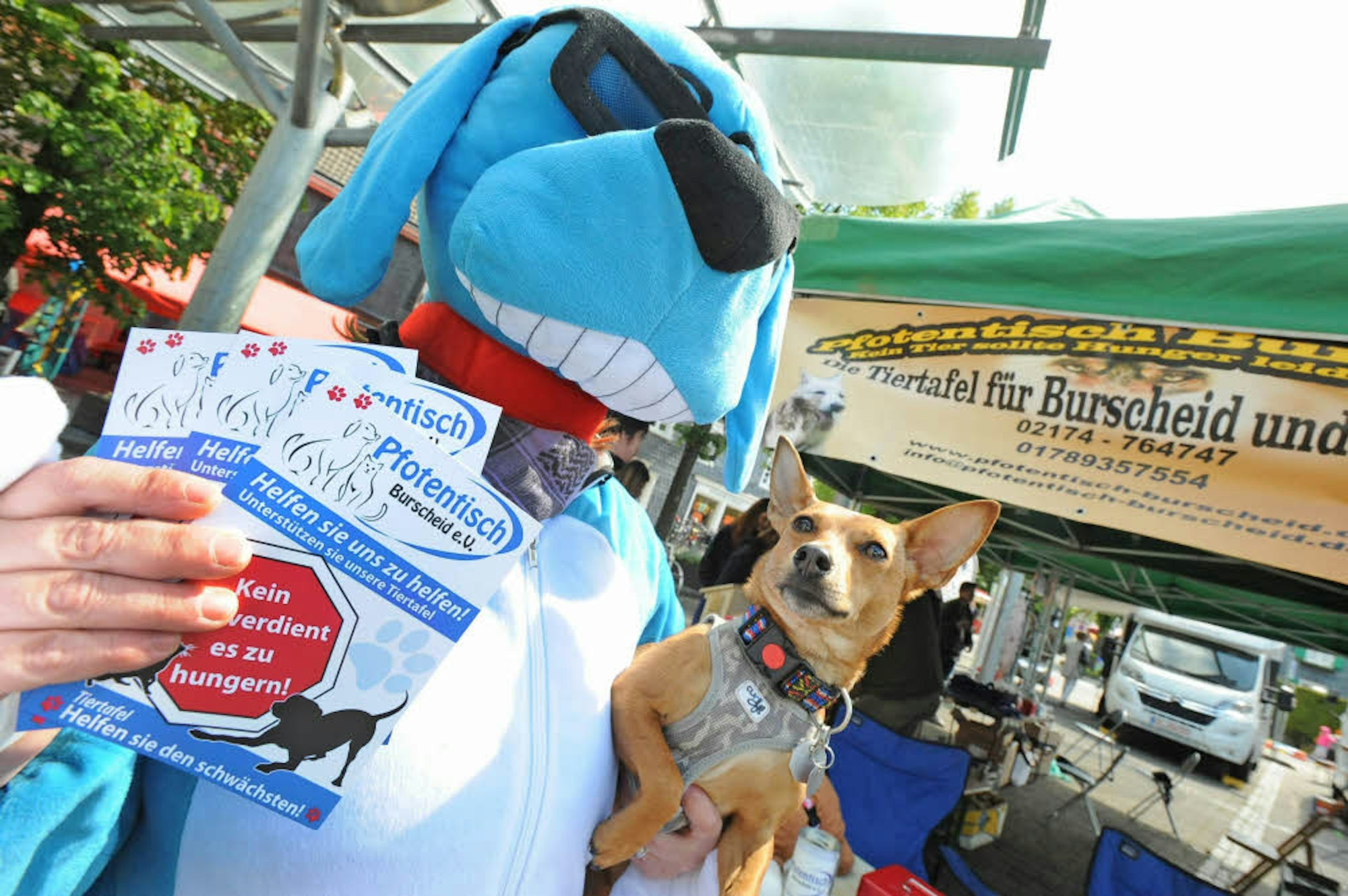 Krissi Rottmann vom Pfotentisch mit Hündin Betty am Infostand.