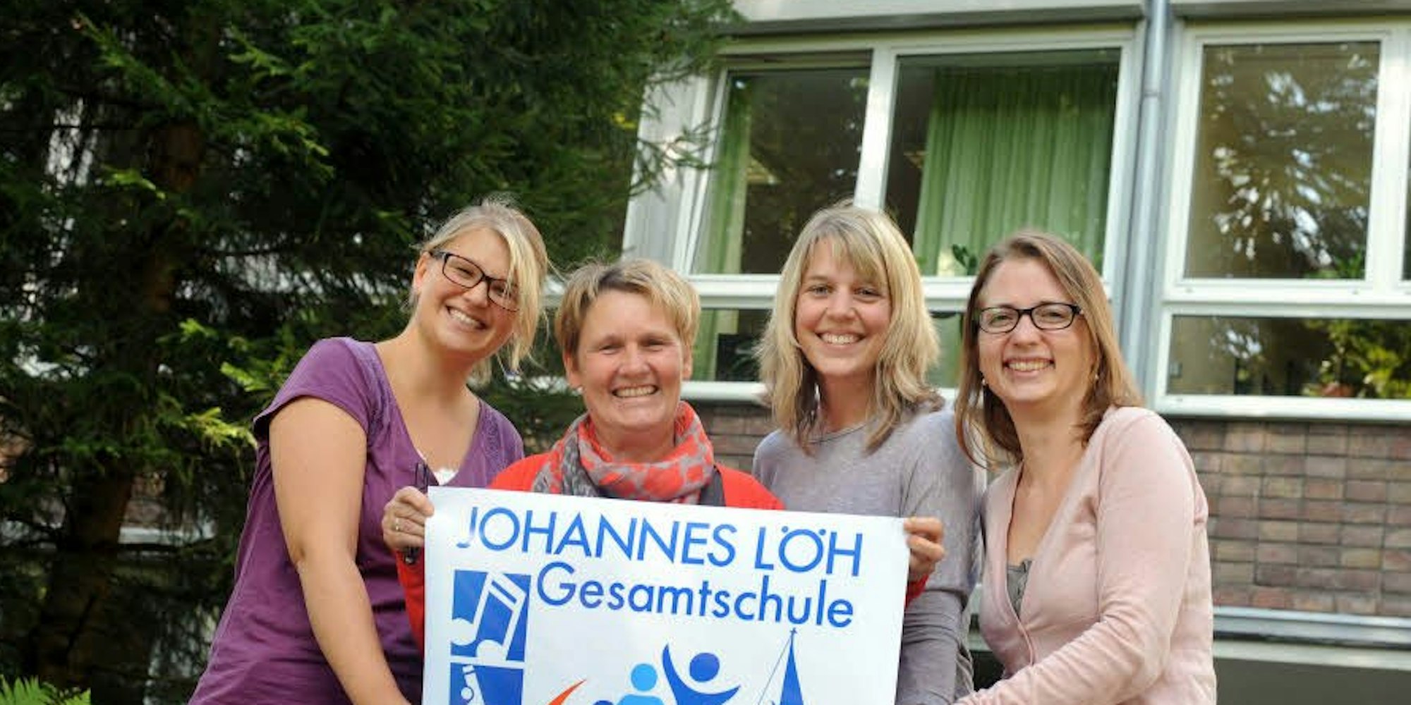 Die neuen Lehrkräfte der Johanns-Löh-Schule (von links) Nadine Velser, Angelika Nordhofen, Melanie Herzhoff und Kerstin Wintzen präsentieren das funkelnagelneue Logo der Burscheider Gesamtschule, die heute ihren Betrieb aufnimmt.