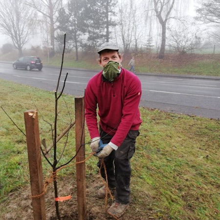 Hilgen – Läuft alles gut, dann könnten im Sommer 2022 schon die ersten Äpfel und Birnen auf der Wiese Ecke Hilgener Straße und Witzheldener Straße geerntet werden. Am Freitag pflanzte der Nümbrechter Baumpfleger Harald Hamel entlang des Fußwegs eine Hecke aus Spalierobst. Zwei Birnbäume und vier Apfelbäume hat der Verein „Burscheid Live“ jetzt möglich gemacht.