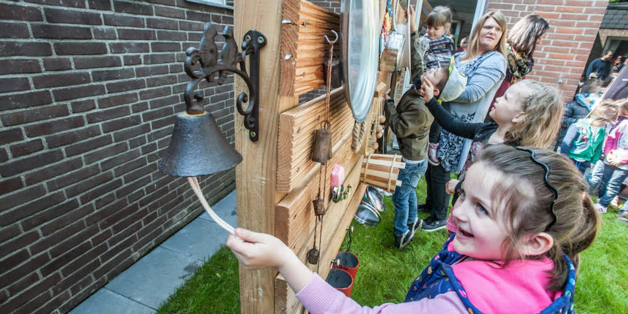 Insgesamt 17 Gegenstände hängen an der Holzwand und sorgen für unterschiedliche Geräusche. Die Projektleiterin integrierte zudem mehrere Generationen in das Konzept: „Die installierten Glöckchen sind aus Afghanistan, meine Mutter hatte dort Urlaub gemacht und die Kuhglocke gehörte meinem Vater, er lebte auf einem Bauernhof.“ Doch auch die Eltern der Kinder spendeten Alltagsgegenstände wie eine Pfanne oder einen Kochlöffel.