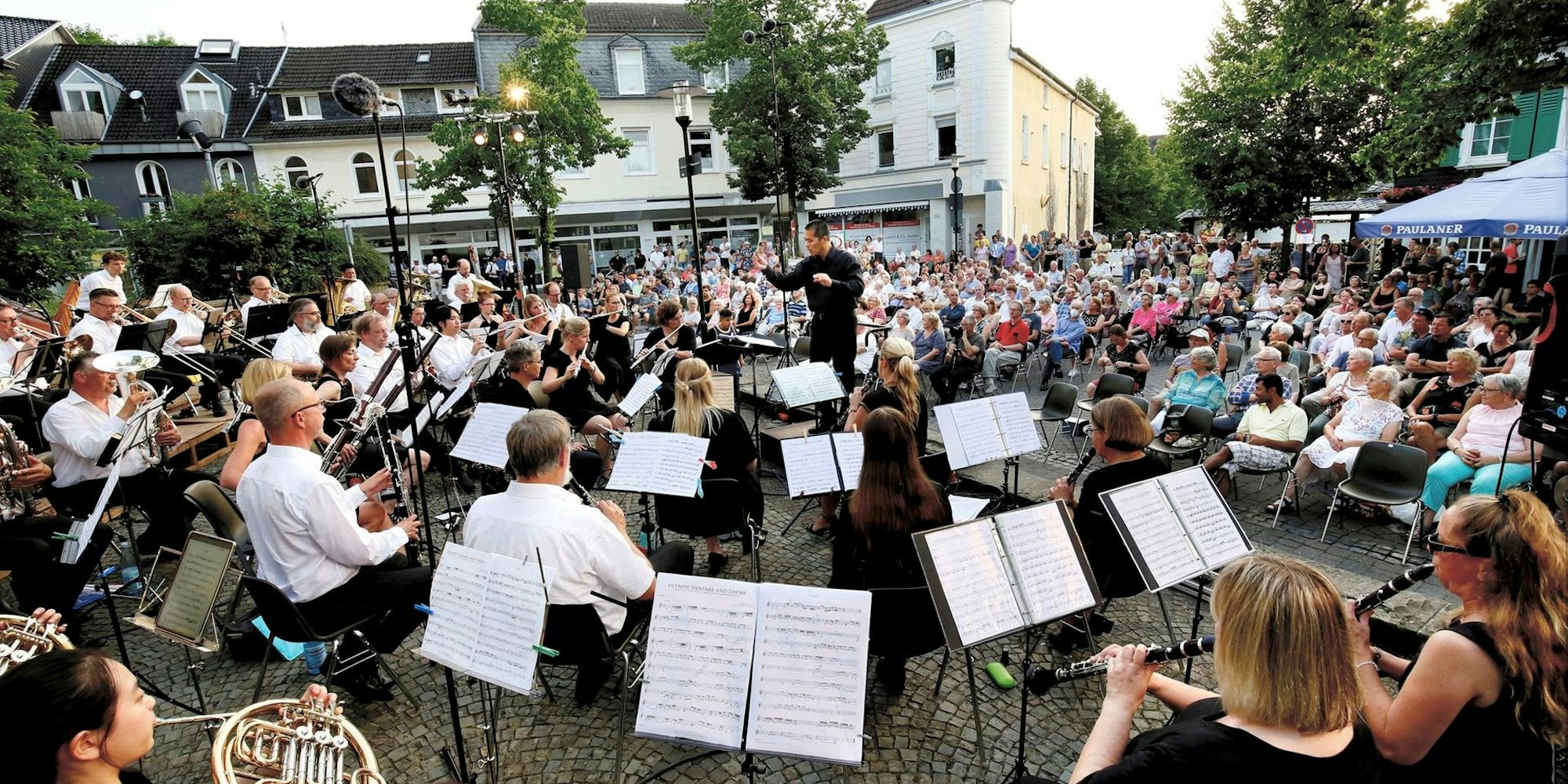 Burscheid – Wie Open-Air-Kino fühlte sich die Sommer-Serenade am Samstag an. Am bisher heißesten Tag des Jahres beschallte der Orchestervereins Hilgen (OVH) die Innenstadt mit seinen vollen sinfonischen Klängen. „Film ab“ war der Titel des Programms nicht umsonst, da das Konzert einen der erfolgreichsten Filmmusikkomponisten ehrte: John Williams. Der Amerikaner feiert in diesem Jahr seinen 90. Geburtstag – und der OVH gratulierte ihm beim jährlichen kostenfreien Konzert in der Kirchenkurve.