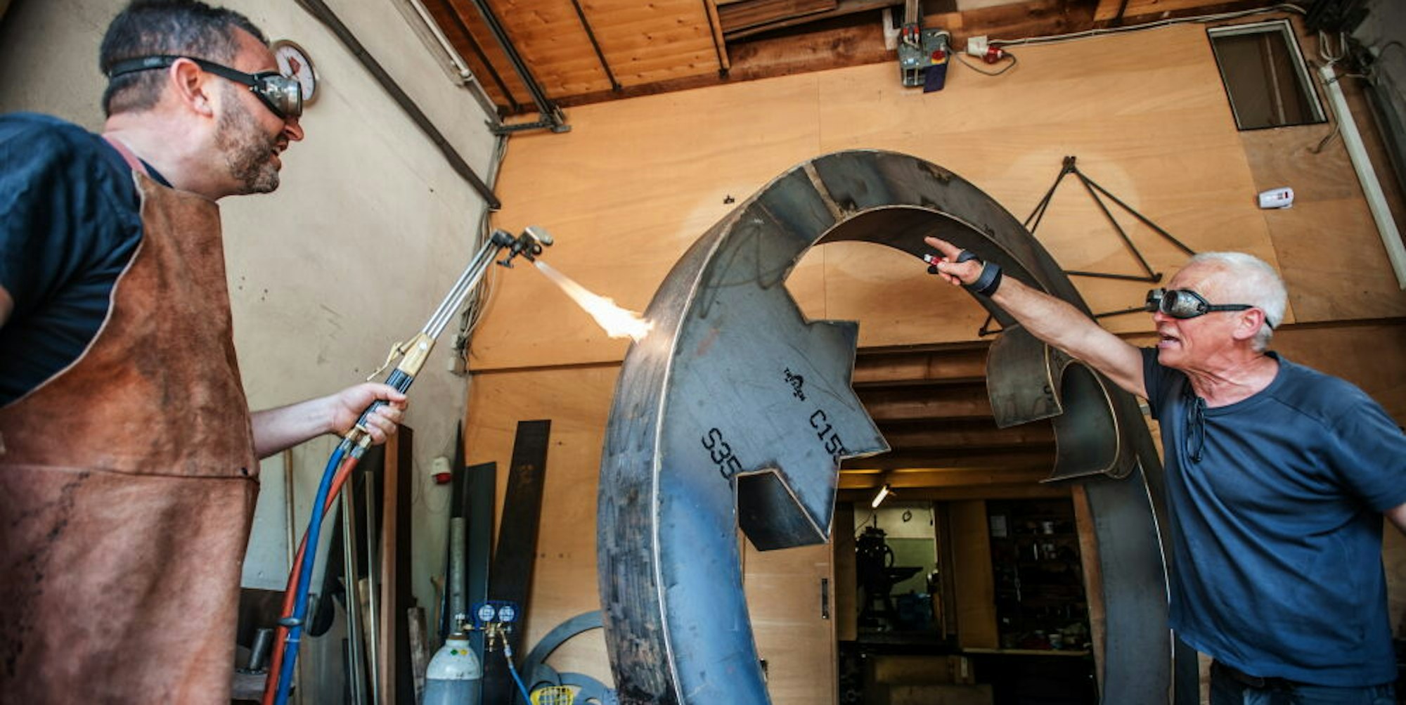 Husam Moner (links) und Gregor Merten arbeiten gemeinsam an der über zwei Meter großen Stahlskulptur.