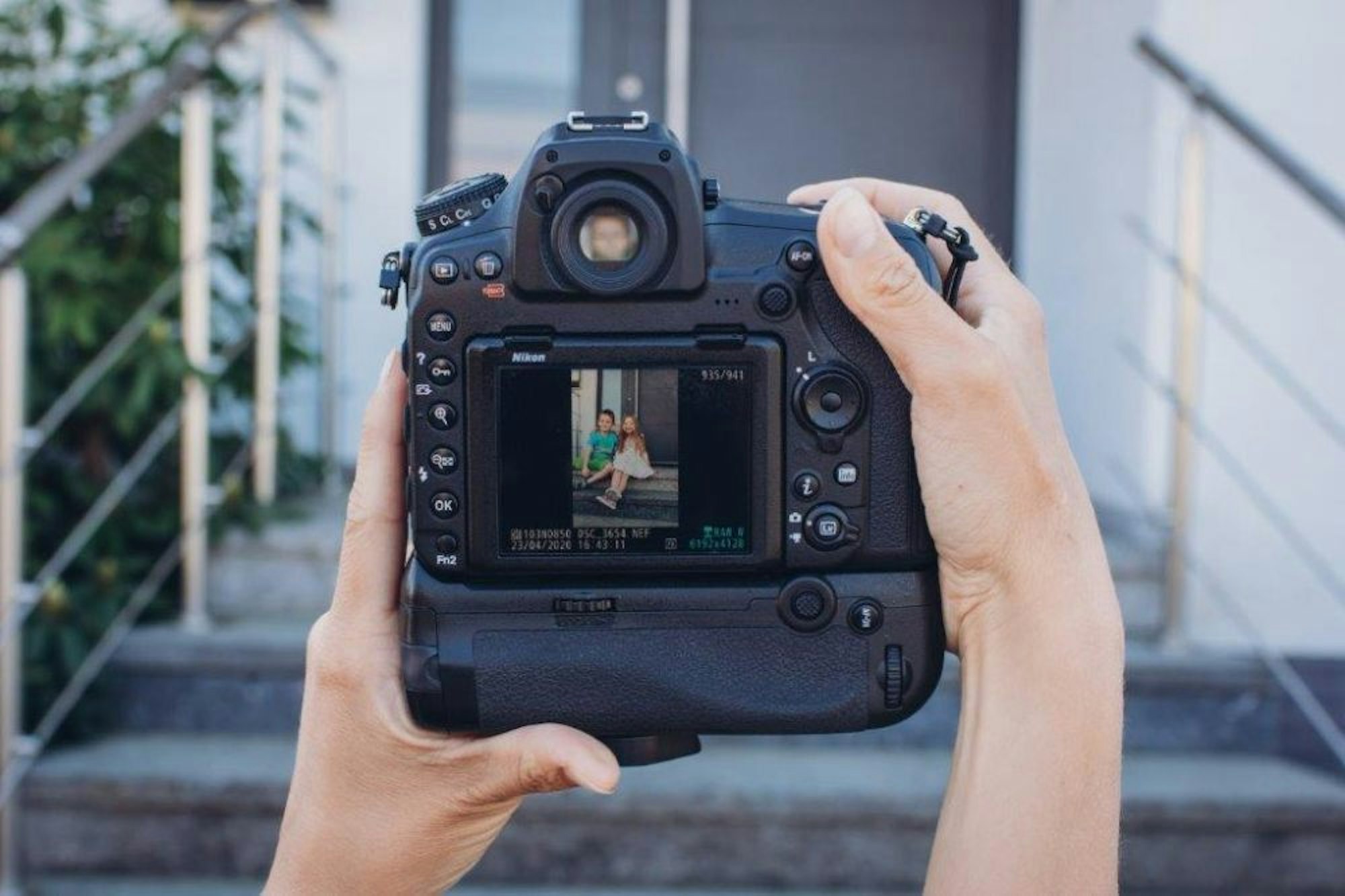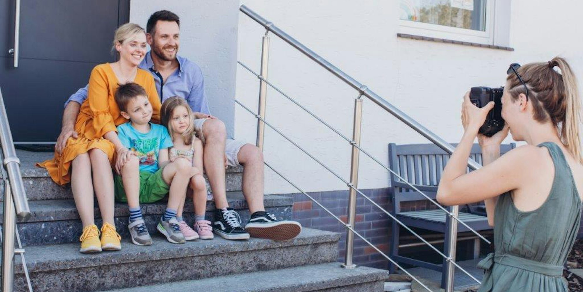 Als Hintergrund ist immer die Tür, der Hauseingang, zu sehen: Anna Zeller beim Corona-Foto-Shooting mit einer Familie.
