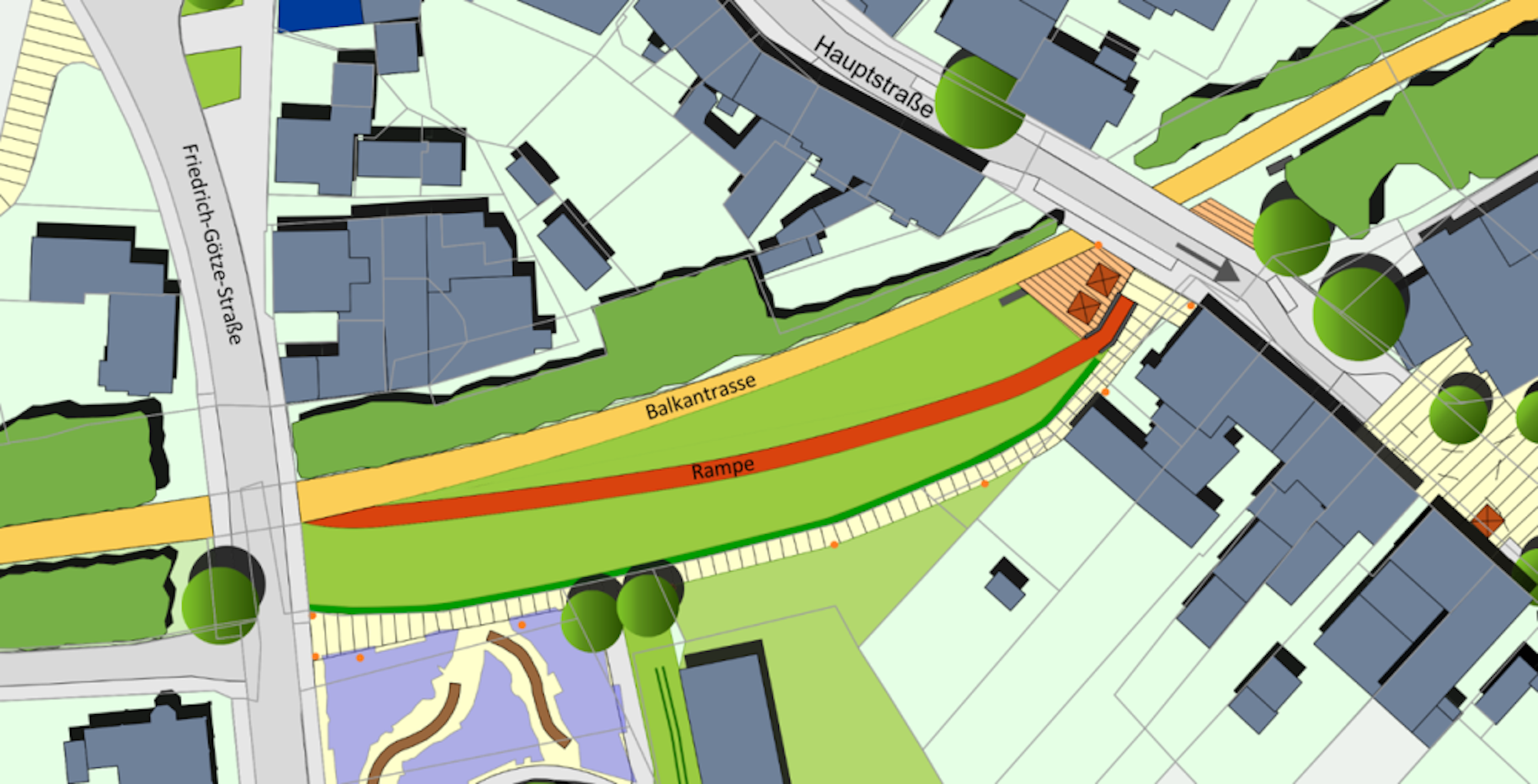 An der Böschung wird der Balkan-Radweg mit der Hauptstraße verbunden, die im Brückenbereich eine Plattform erhält.