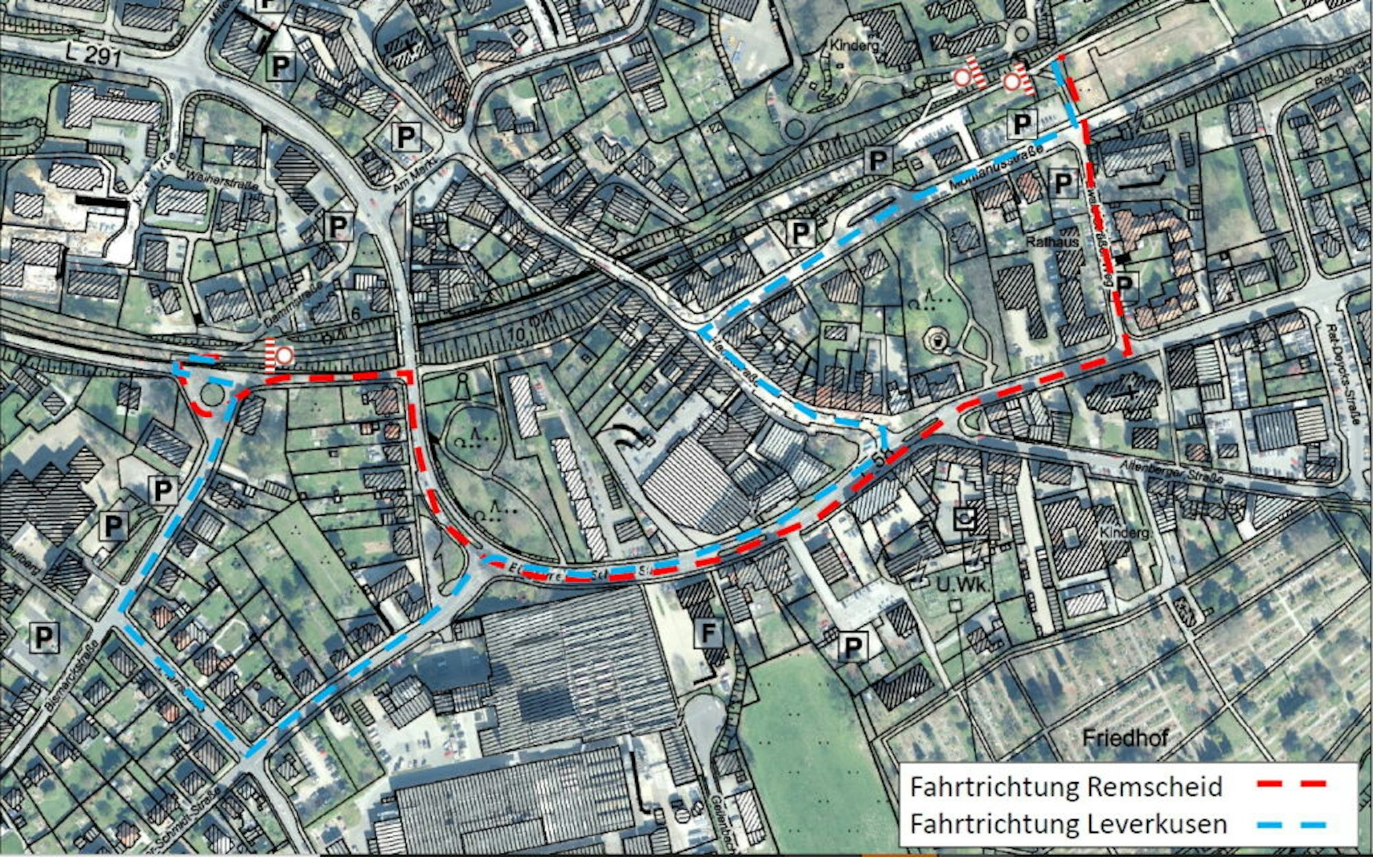 In Fahrtrichtung Leverkusen wird der Radverkehr über die Montanusstraße zur Hauptstraße in Richtung Bürgermeister-Schmidt-Straße, rechts in die Pfarrstraße und über die Bismarckstraße zurück auf den Radweg umgeleitet.