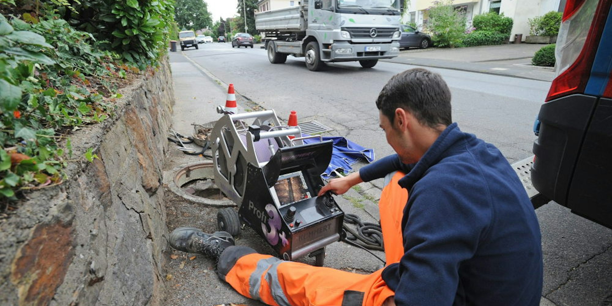 „Bei der Gesamtnetzlänge von rund 130 Kilometern, 5000 Grundstücksanschlussleitungen und mehreren tausend Sinkkastenleitungen, müssen jährlich acht Kilometer Hauptkanalisation einschließlich der angeschlossenen 450 Grundstücks- und Sinkkastenanschlussleitungen inspiziert werden.“