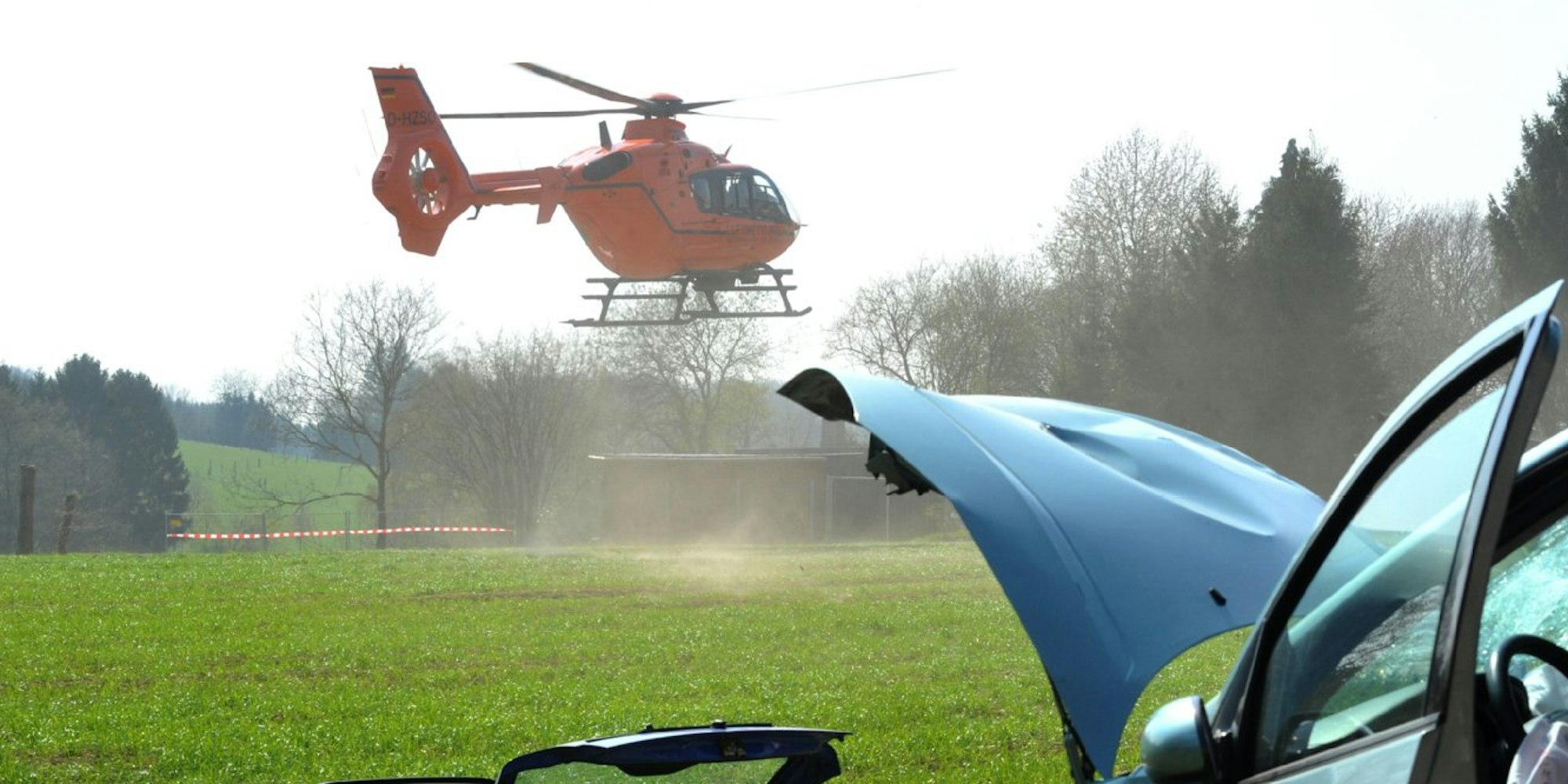 Burscheid – Rettungshubschrauber Christoph III startete von der Wiese neben der L 291 nahe der Stadtgrenze Leverkusen/Burscheid.