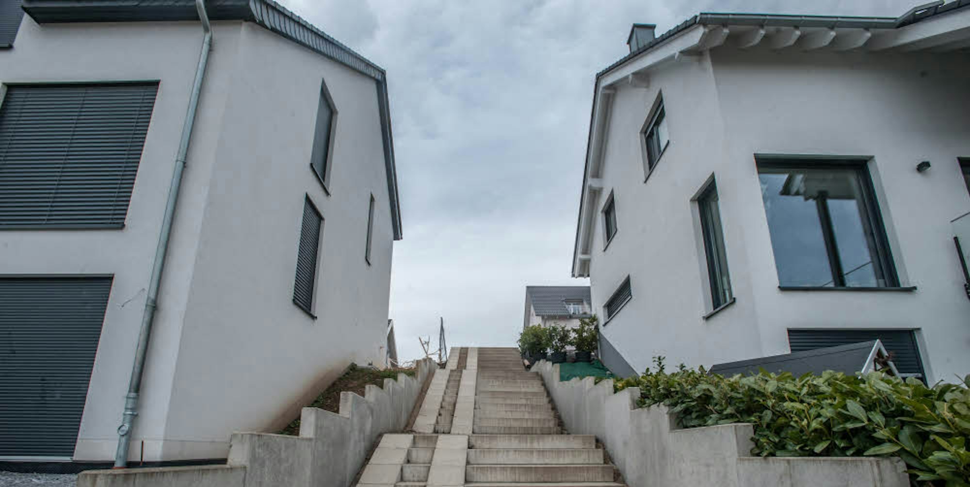 Eines der neueren Baugebiete Leverkusens ist der Leimbacher Berg. Diese Treppe führt zur August-Macke-Straße.