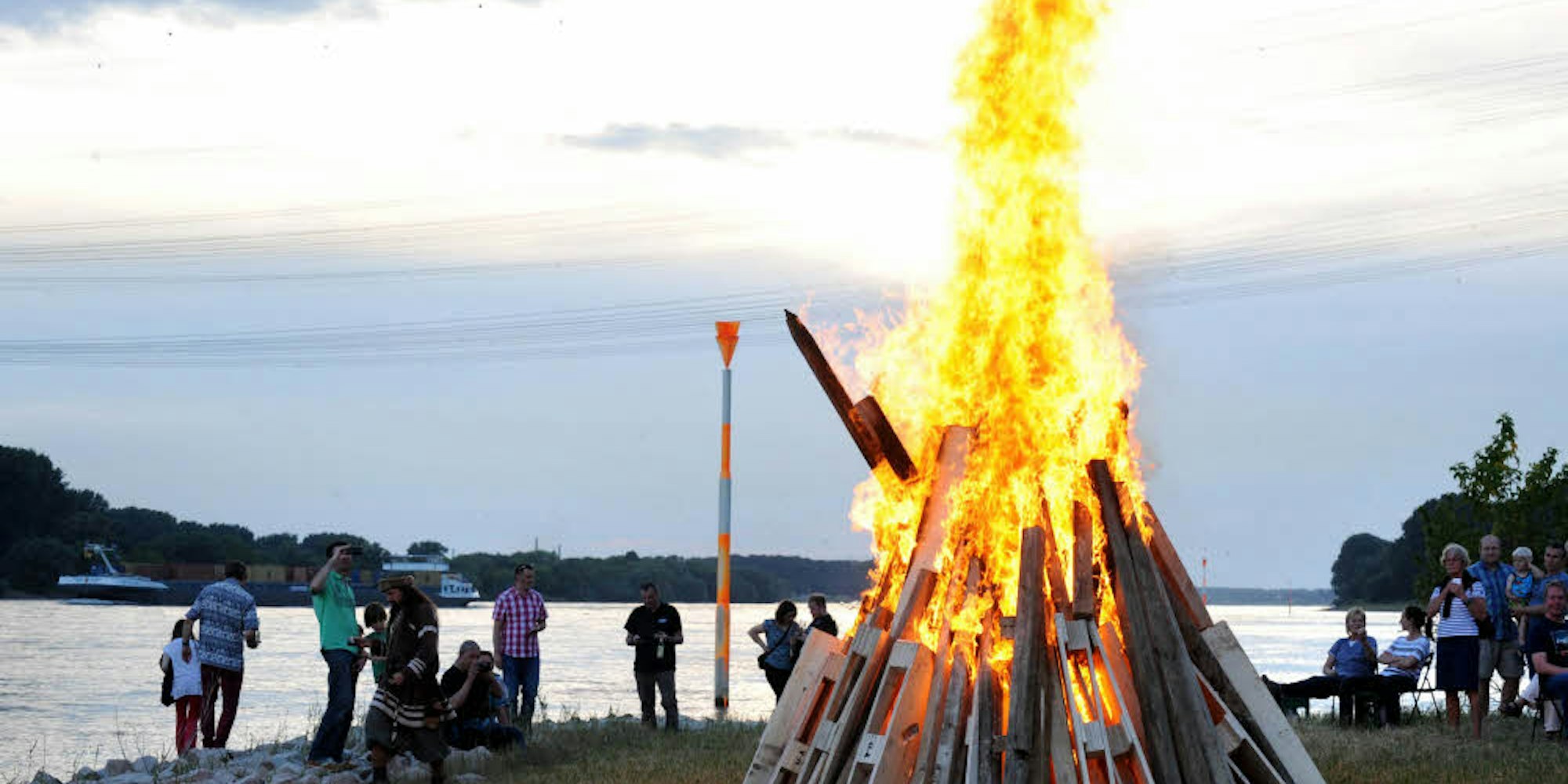 Haushoch lodernde Flammen am Rheinufer: So wurde das Mittsommerfest an der Schiffsbrücke Wuppermündung gefeiert.