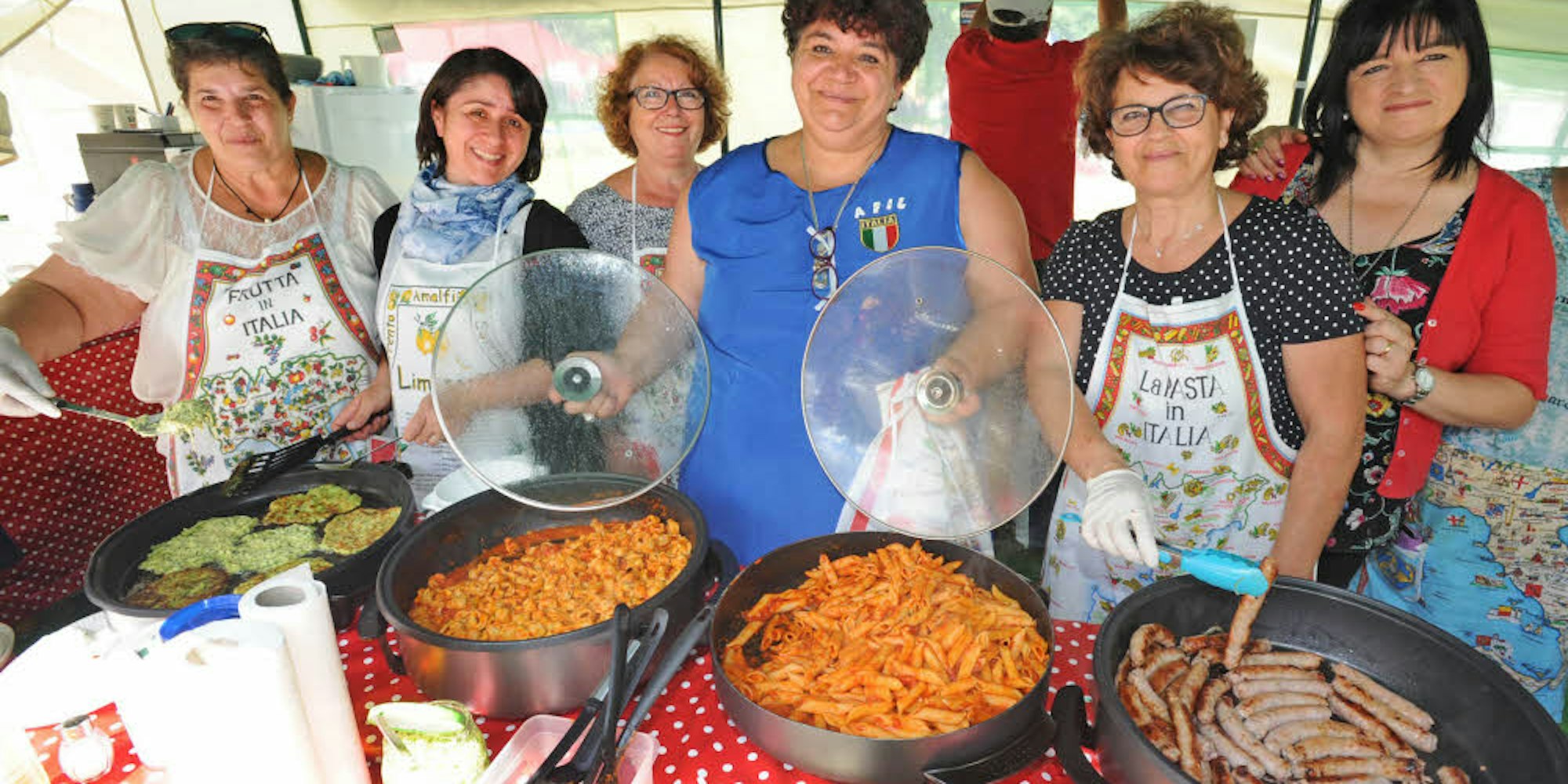 Am italienischen Stand gab es Würstchen mit Nudeln oder Tortellini, Puffer, Waffeln und Cocktails. Die Hitze im Zelt fächerten die Damen mit den Topfdeckeln fort und mit Grappa oder Limoncello-Likör waren die Besucher zuerst etwas vorsichtig.