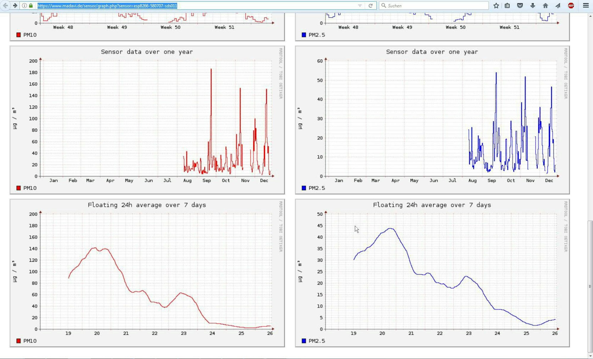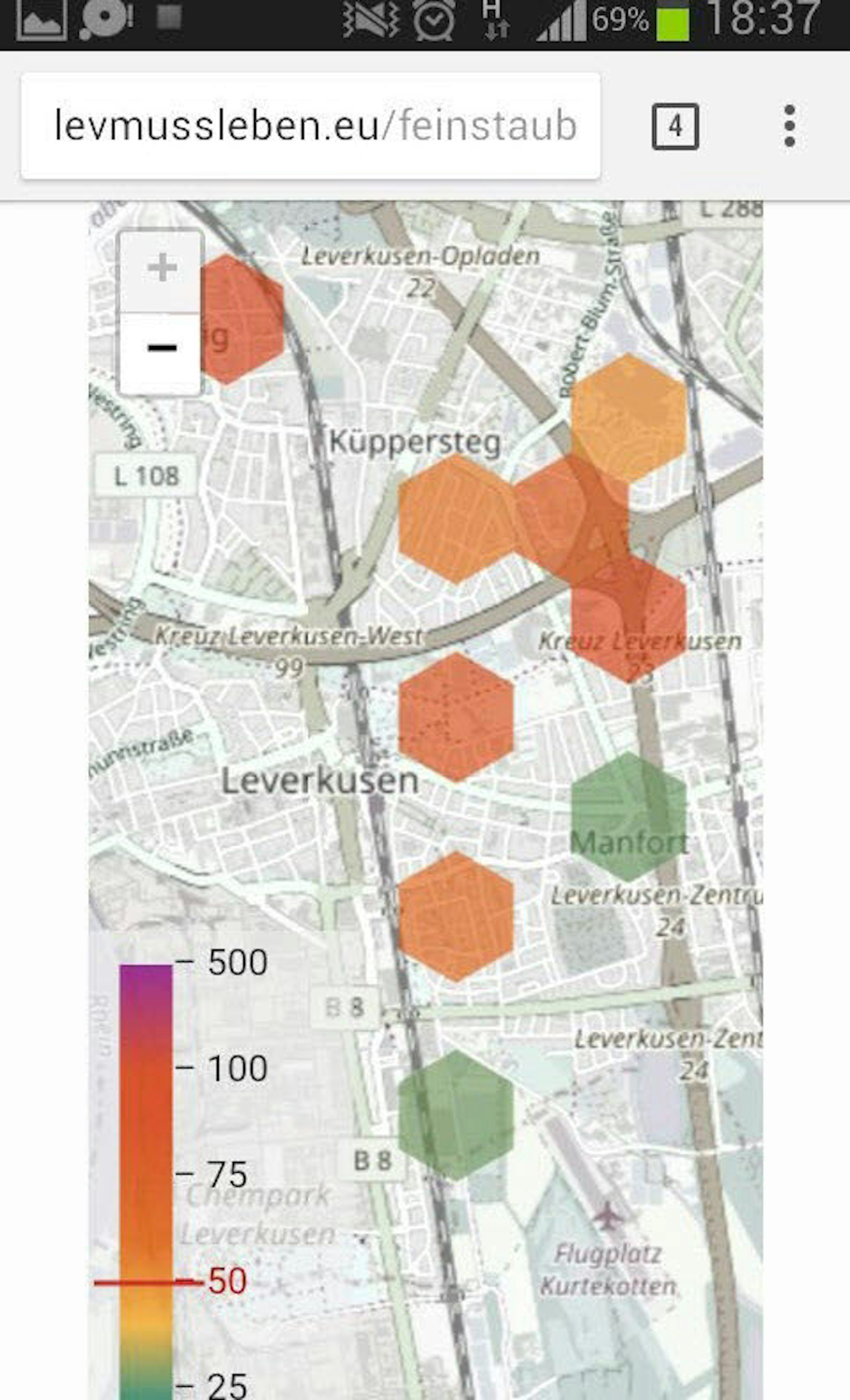 In tiefem Dunkelrot, also mit extremen Werten von über 200 µg, fielen besonders die Ergebnisse der privaten Messstellen in Küppersteg nahe am Leverkusener Autobahnkreuz auf. Aber auch eine Messanlage an der Realschule am Stadtpark in Wiesdorf zeigte einen über Tage anhaltenden Ausschlag von deutlich über 100 µg an. Andere, weiter entfernte Sensorenwerte hielten sich in Grenzen: Ihre Farbe zeigt dann Grün auf der Internetkarte. Die amtliche Messung an der Gustav-Heinemann-Straße zeigte auch hohe Werte, aber nicht in "Peking-Qualität"; sie blieben im Vergleichszeitraum stets knapp unter 50 µg.