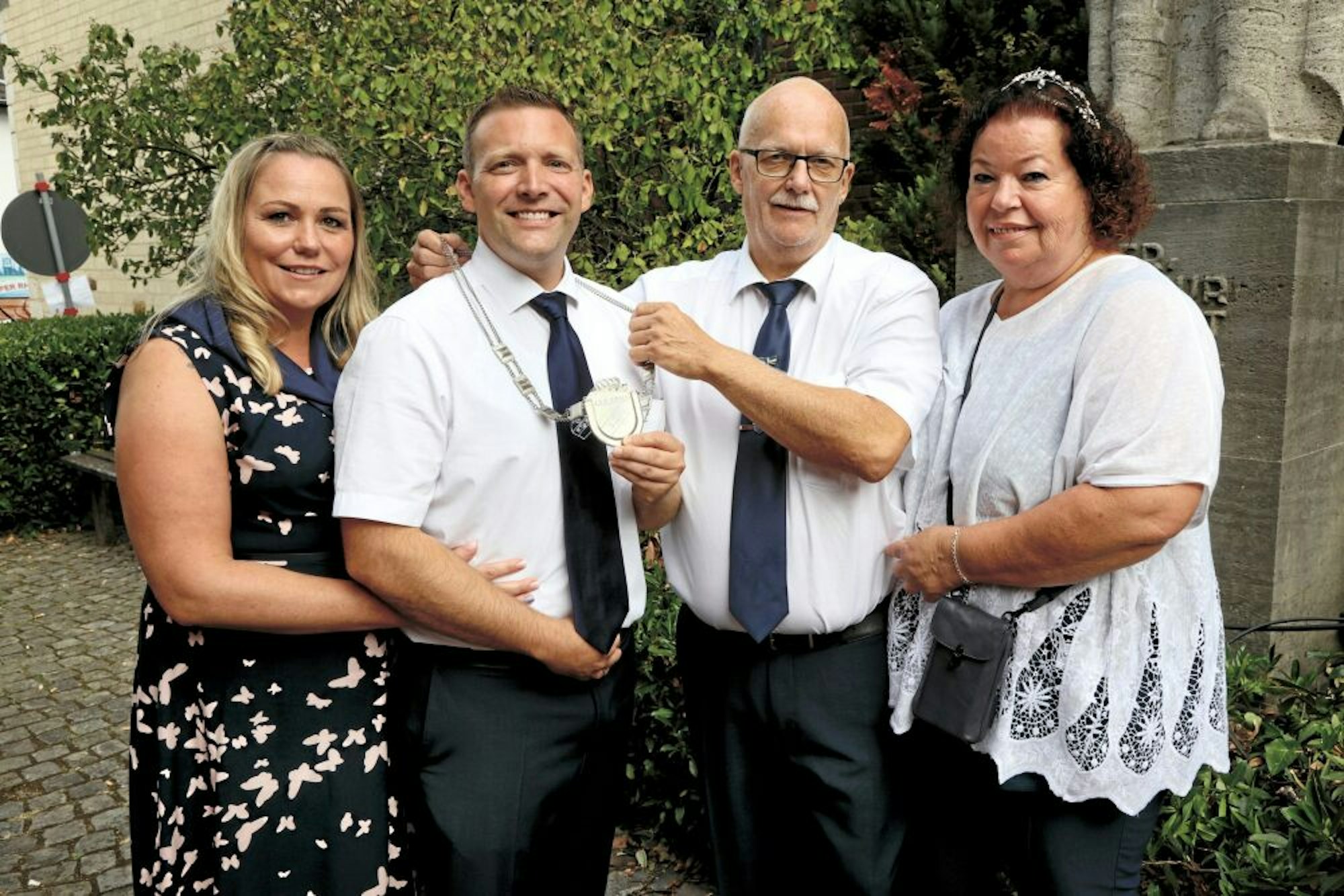 Die Hahnekönigswürde erhielt Markus Loewen (mit Ehefrau Magdalena Krönen) in Form dieser Kette von seinem Vorgänger Michael Annison (mit Gattin Sandra Loewen) überreicht.