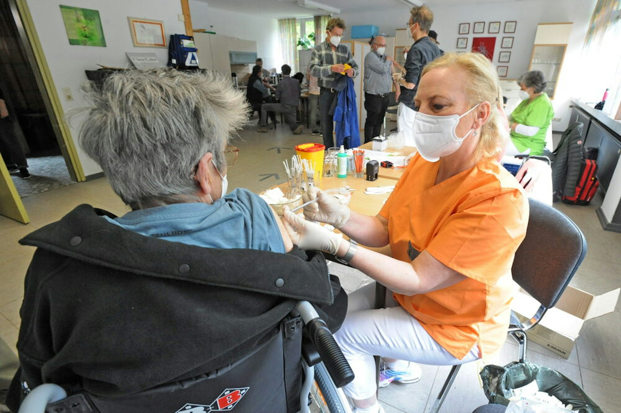 Elfriede Höller wird von Dr. Simone Bodenhausen geimpft. In den Awo-Räumen waren fünf Impfstationen in Betrieb.