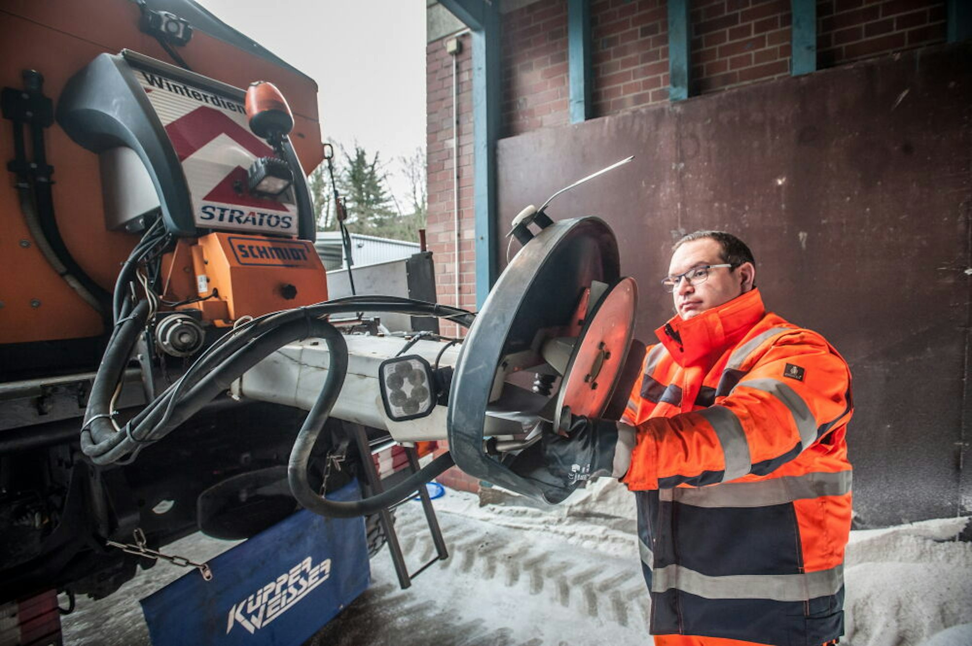 Bauhof-Mitarbeiter Markus Kaminski, der auch die Kehrmaschine fährt, überprüft den Salzstreuer eines Räum-Lkw.