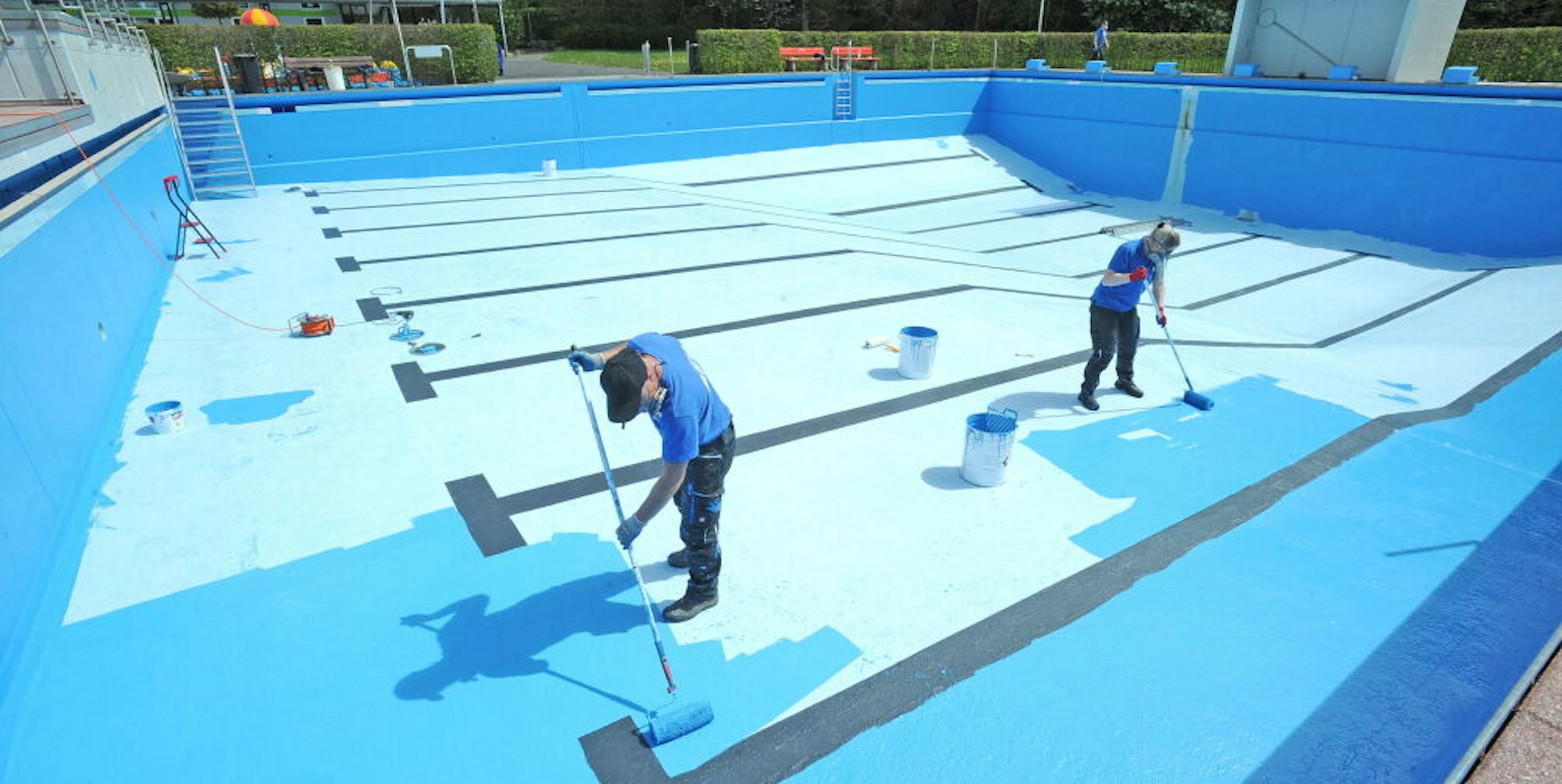 Die Vorbereitungen für die Freibad-Saison laufen: Das Schwimmbecken am Schulbusch wird blau gestrichen.