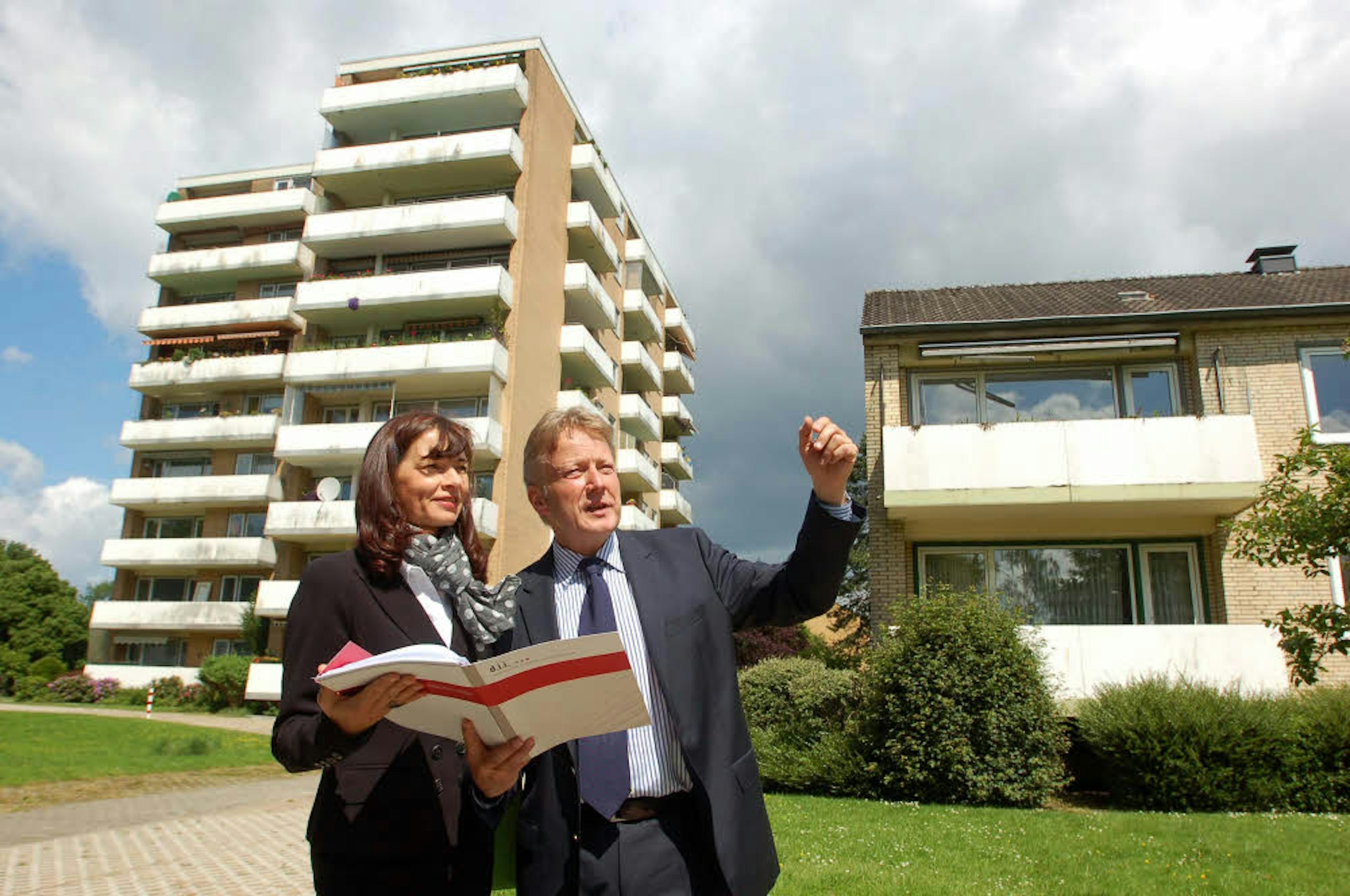 Als die dii in Cremers Weiden einstieg (im Bild Prokurist Thomas Settelmayer mit Architektin Annette Leidenfrost im Mai 2014) wurde auch der Dachausbau der Mietshäuser angekündigt. Dazu kam es nicht.