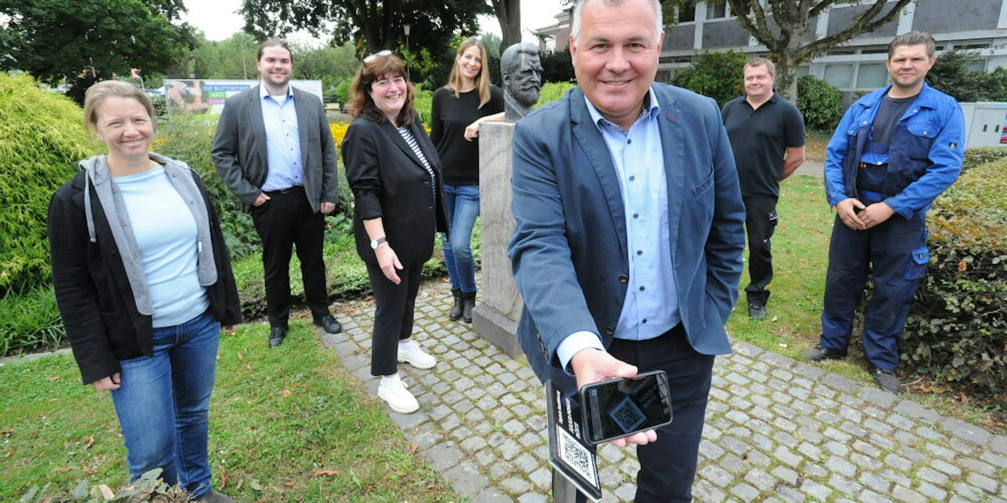 Startschuss für die digitale Stadtführung an der Büste von Seilbahn-Pionier Julius Pohlig an der Kirchstraße: (von links) Katja Blumenberg, Marc Sievert, Ute Gerhards, Melanie Herzog, Frank Steffes, Andreas Fomin und Tim Nickel.