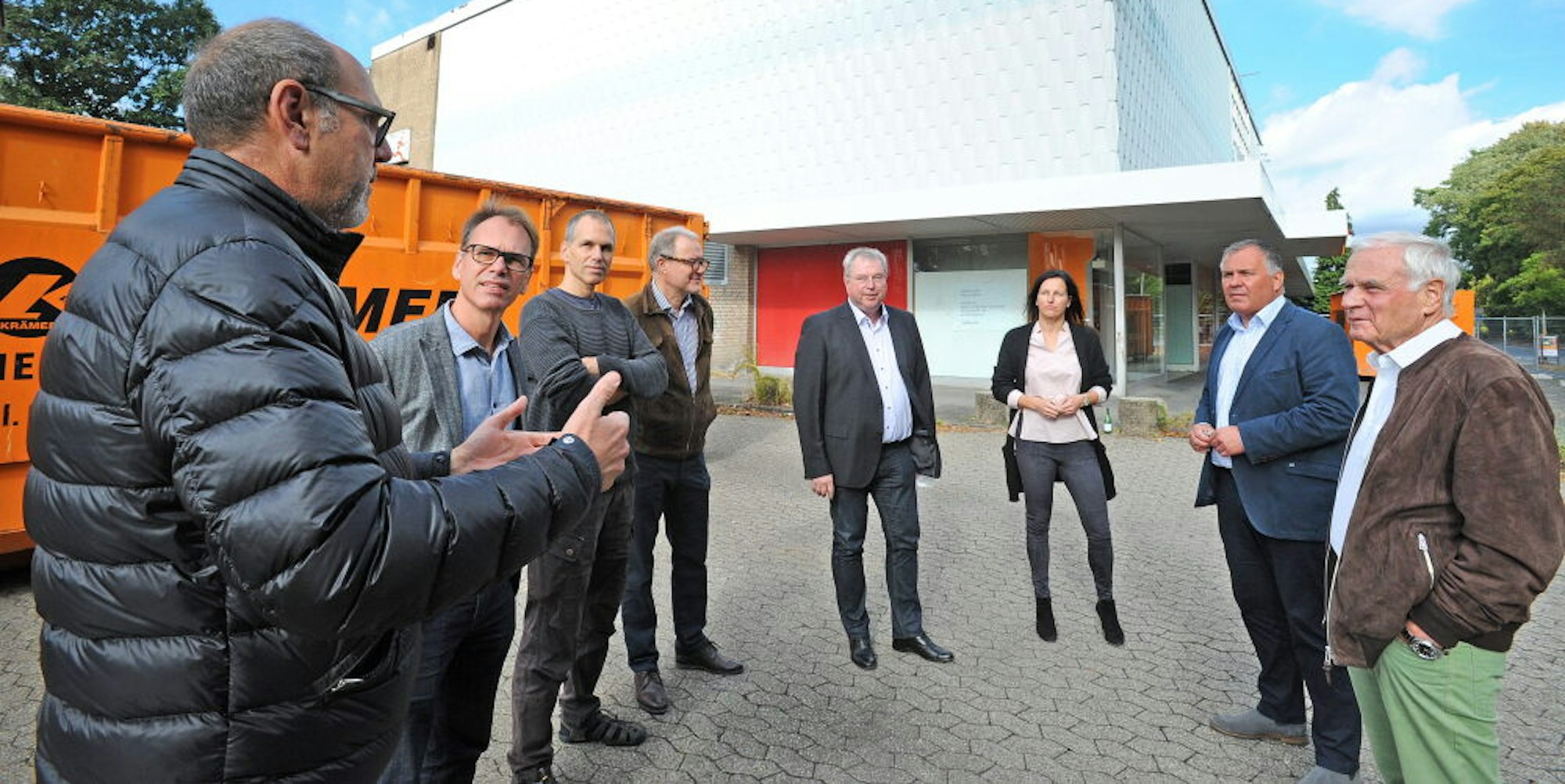 Die Bauschutt-Container sind da: Abbruchunternehmer Ludwig Krämer (v.l.), Andreas und Martin Pässler, Clemens von Dryander, Michael Sundermann, Planungsamts-Leiterin Mirjam Kerkhoff, Bürgermeister Frank Steffes und Klaus Pässler vor dem Kaufpark.