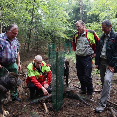 Bestatter Ralf Aschenbroich (von rechts) mit Bürgermeister Frank Steffes und Landwirt Karl-Otto Dickhoven als Beauftragtem des Eigentümers Graf Mirbach von Harff an einem der Bäume des künftigen Friedwaldes im Vorster Busch.