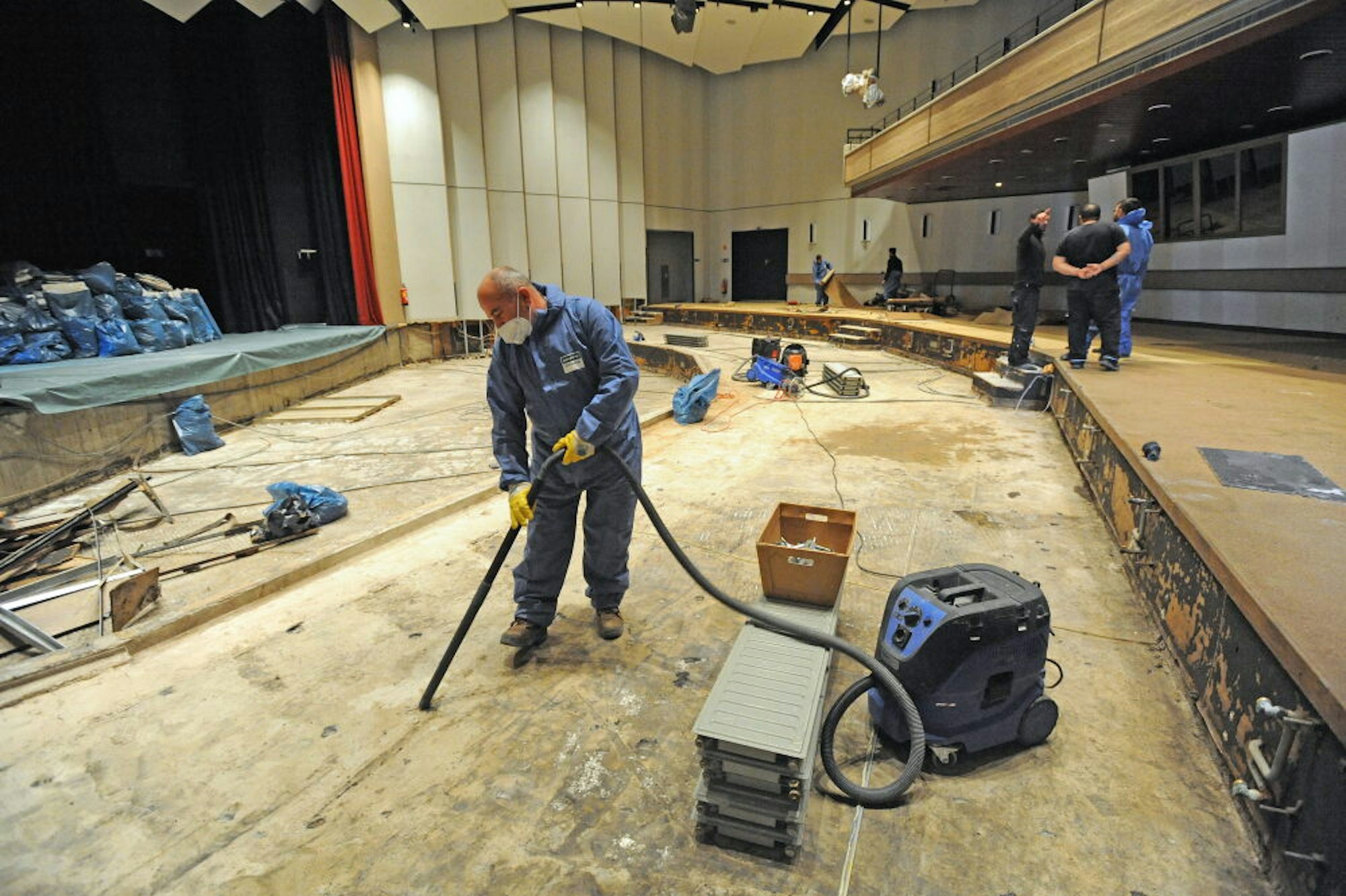 Die Aula des Gymnasiums Am Hammer, größter Festsaal der Stadt, soll mit Sporthalle und dem früheren Hauptschulgebäude in einem Paket von einem Generalunternehmer saniert werden und wird der Stadt und ihren Vereinen ebenfalls noch so lange fehlen. Sie ist nach der Trocknung nahezu in den Rohbauzustand zurückversetzt worden.