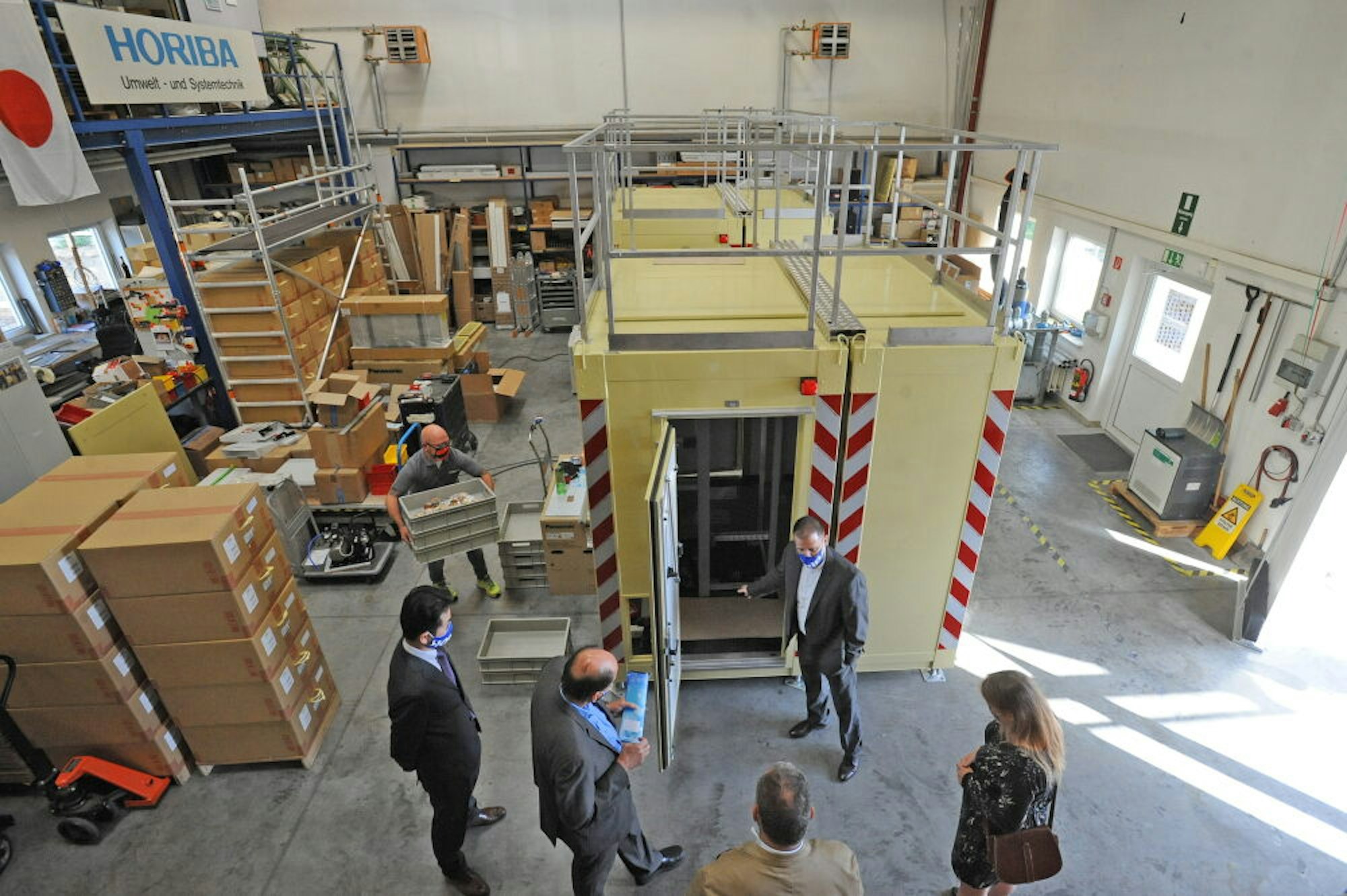 Blick in die Werkshalle von Horiba mit Containern für Luftmess-Stationen.