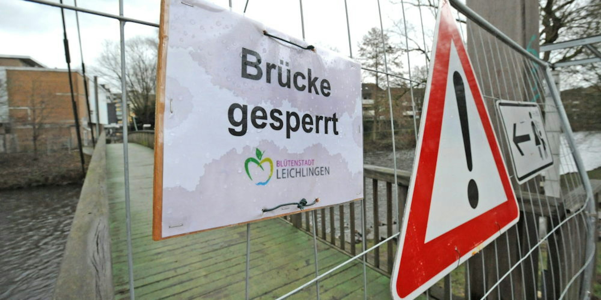 Seit Oktober 2019 ist die Fußgängerbrücke zwischen dem Leichlinger Rathaus und dem Marktplatz gesperrt, weil die Pylone, an denen der Übergang aufgehängt ist, unten morsch sind. Anfangs war von nur einigen Tagen Sperrung die Rede. Die Hoffnung auf eine rasche Instandsetzung zerstob aber schon bald, weil sich die Sanierung als teuer und kompliziert herausstellte.