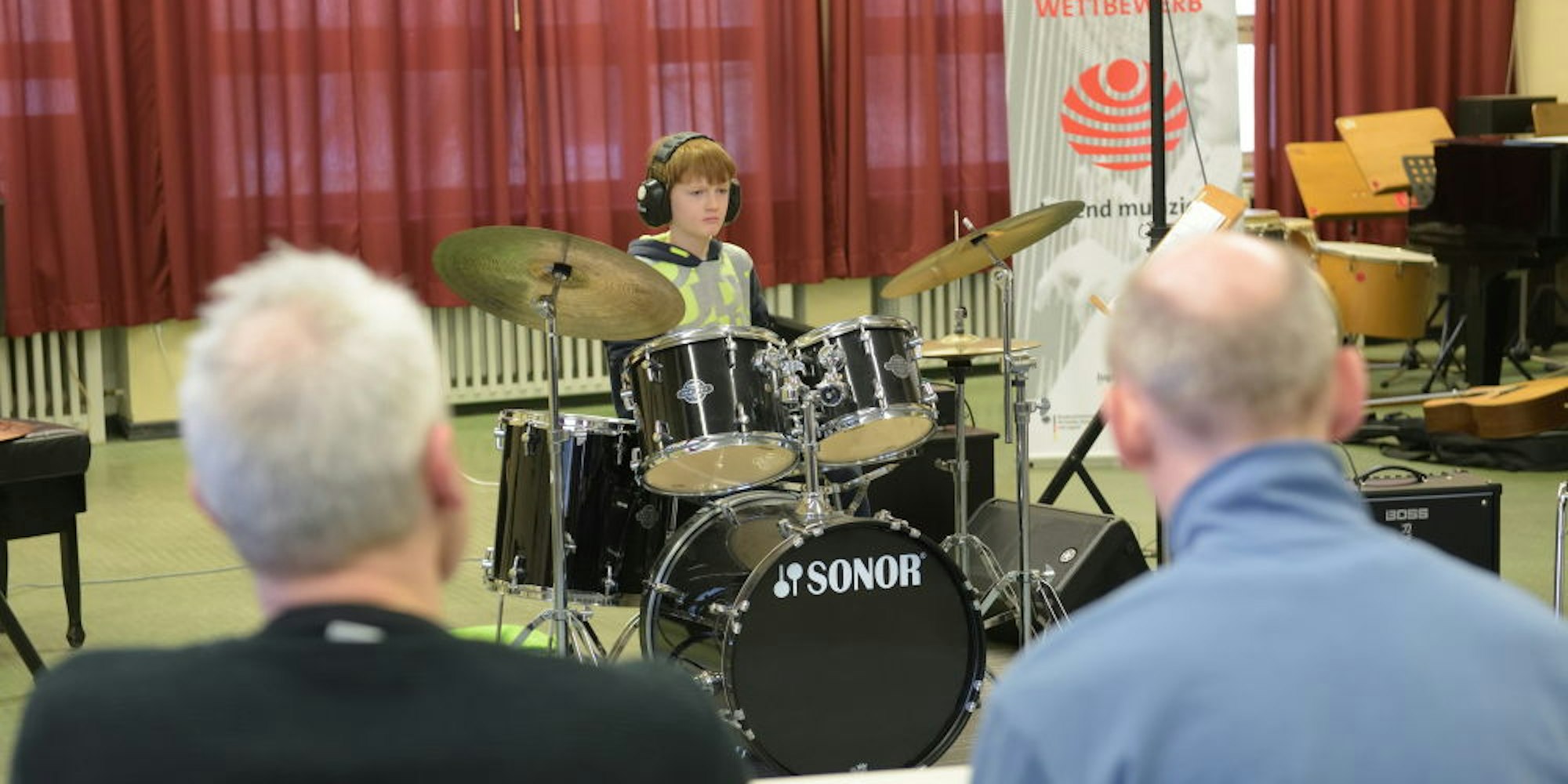 Lange vor seinem Auftritt ist der 14-jährige Marc André Jörrens mit den Eltern angereist – samt der eigenen Drummer-Ausstattung im Gepäck. Damit darf der Papa sogar bis an die Rampe vorfahren zum Ausladen. Mit geübtem Griff stellt Marc André Becken, Drums, die große Base-Drum und den Double Bass auf, mit dem er auch mit den Füßen auf zwei Drums den Rhythmus schnell vorantreiben kann. Noch hat er keinen Sound-Check gemacht, aber er gibt auf dem schuleigenen Schlagzeug eine Kostprobe seines Könnens: Gleich geht er in die Vollen mit den Schlegeln, lässt sie in rasender Geschwindigkeit über die Drums wirbeln, schlägt zwischendurch die Becken an. Vor der Jury tritt er mit „Street Urchins“ von Billy Cobham, „Nightmare“ von Matthew Charles Sanders, Billie Joe Armstrongs „American Idiot“ und einem selbstkomponierten Solo an. Vor sechs Jahren hat er angefangen mit dem Schlagzeug, spielt inzwischen auch im Jazz-Ensemble „feel good“ mit. Geübt wird im Keller, mit den Nachbarn hat man sich arrangiert.