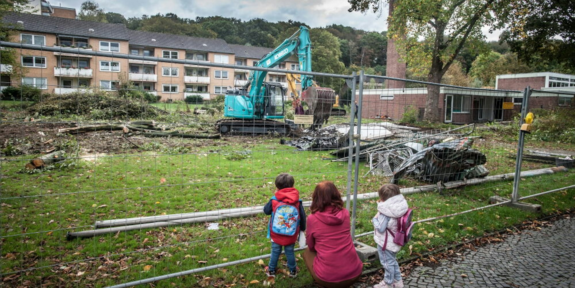 Mit Baumfällungen haben die Bauarbeiten für die neue Kita neben der Grundschule Büscherhof begonnen. Als nächstes fällt der Schornstein des Hausmeister-Bungalows rechts.