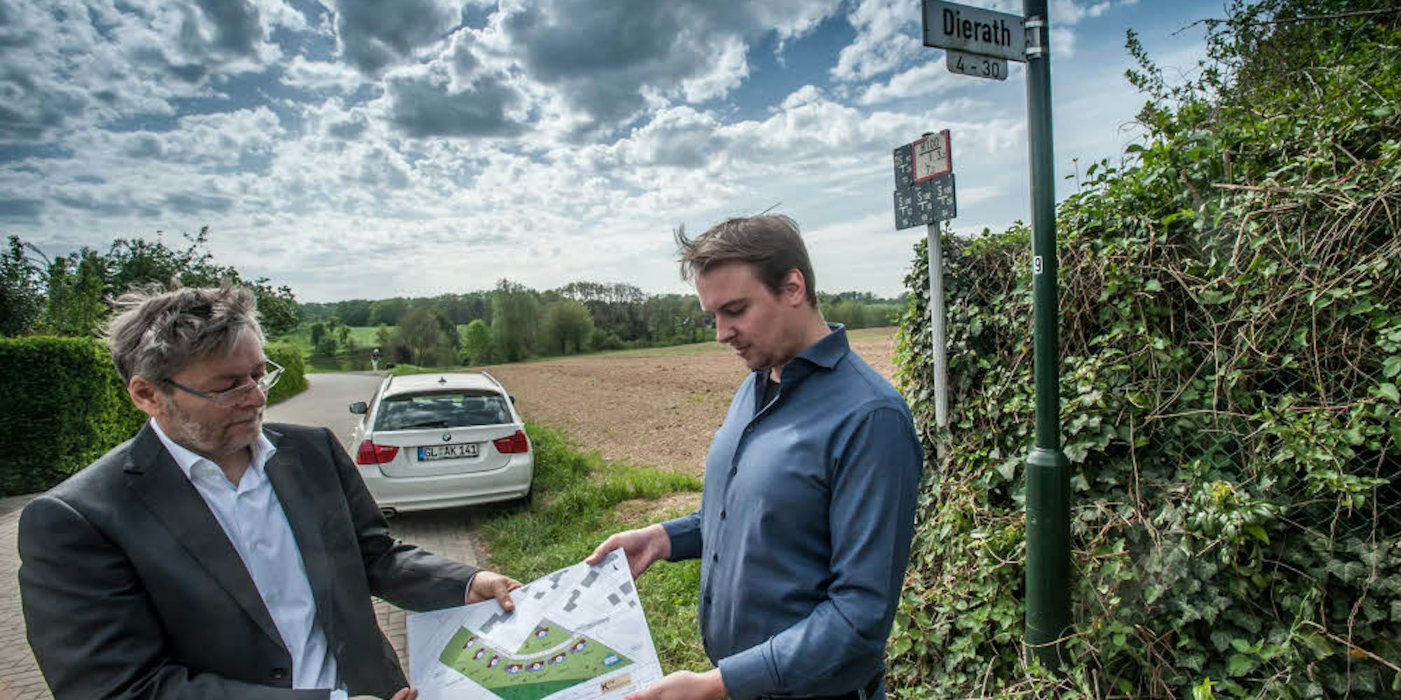 Projektentwickler André Kleinpoppen (l.) und sein Kollege Dominic Loker mit dem Bauplan der acht Klimaschutzhäuser vor dem Grundstück in Dierath, das sie erschließen wollen. Es reicht von der Ecke am Straßenschild den Acker hinunter bis zum Waldrand.