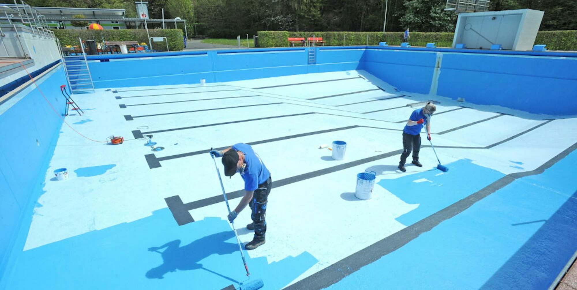 Jahrelang ist das Becken mit blauer Farbe gestrichen worden, die PCB-haltig war. Der alte Lack muss nun aufwändig entsorgt werden.