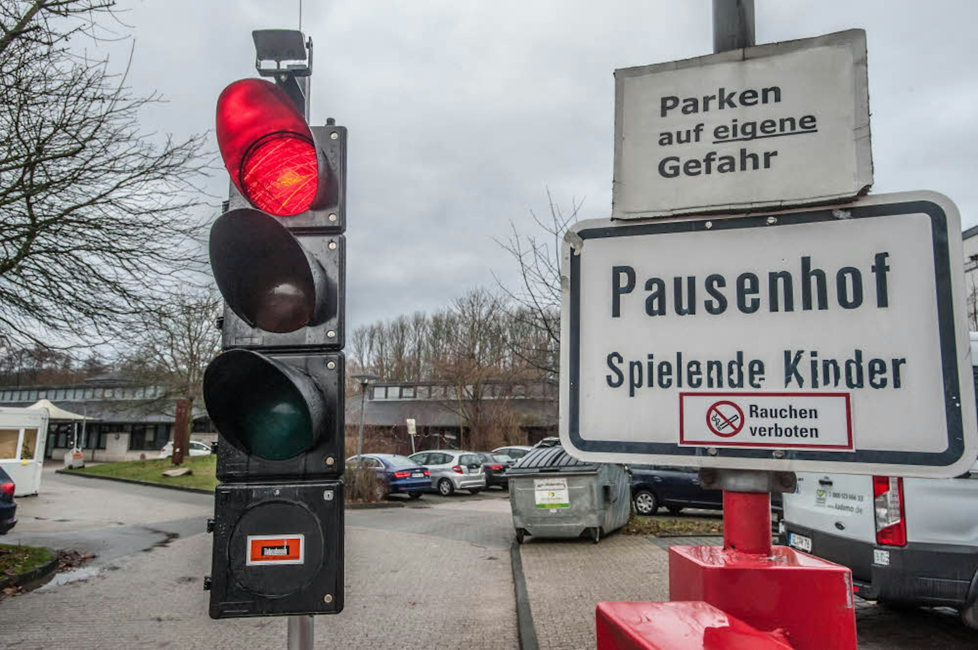 Damit sich Kinder, Bauhandwerker, Schulbusse und Transporter nicht in die Quere kommen, steht am Eingangstor jetzt eine Ampel.