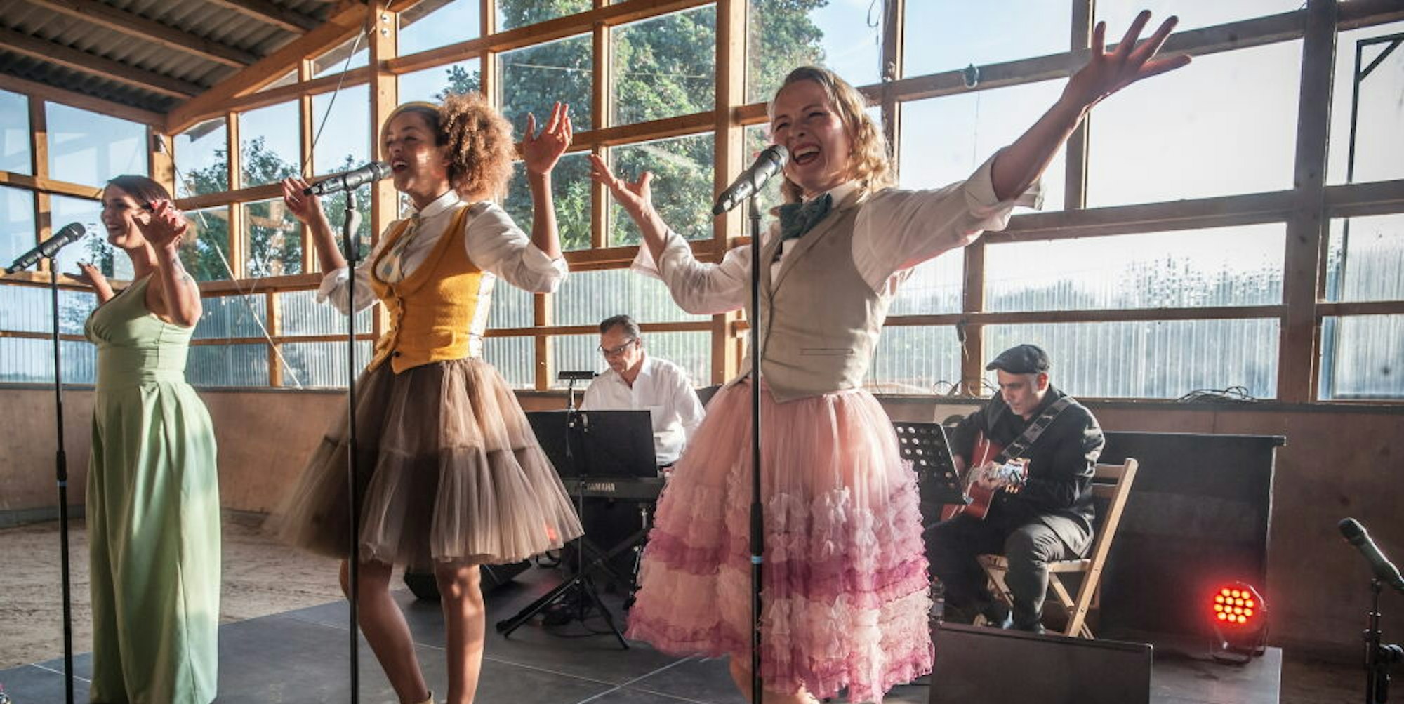 Leichlingen-Witzhelden – Die Sonne geht langsam unter und taucht den Sieferhof in goldenes Licht. Die Pferde wiehern, die letzten Hufe klappern in die Ställe. Drei Frauen betreten die Halle, in der normalerweise Reittraining stattfindet. Locken, Hüte, High Heels und Tüllröcke tragen sie. Ein bunter Mix im Vintage-Design. Sie bringen einen Hauch der 1920er Jahre mit. Statt in Leichlingen hätte der Sieferhof für den Abend in Amerika stehen können. Die drei Damen gehören dem Ensemble „Lou’s the Cool Cats“ an. Hoe-Down, Swing und Pop haben sie in petto, ideal für die ungewohnte Location des städtischen Kulturprogramms im Country-Stil.