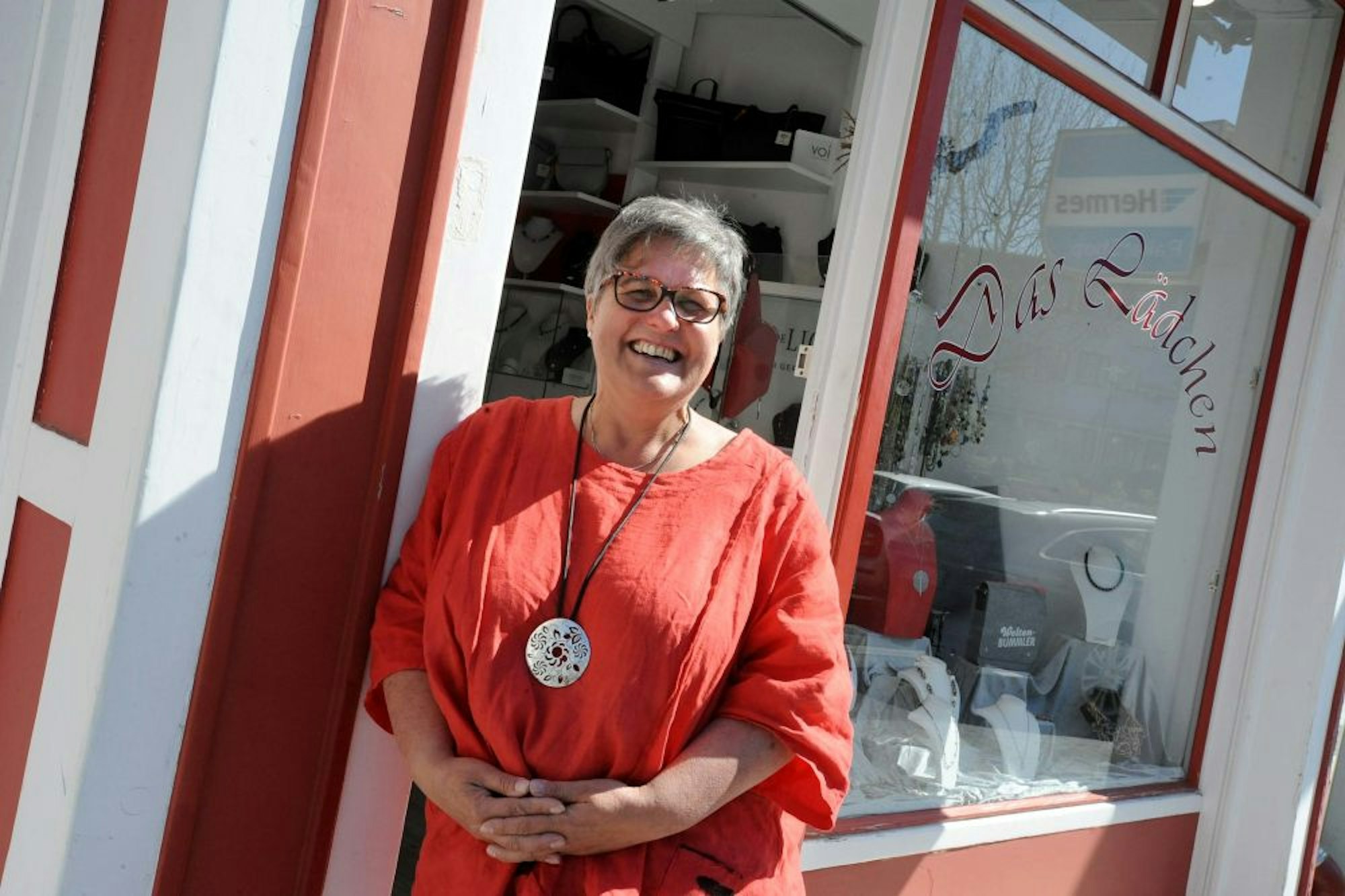 Claudia Hagen vor ihrem Lädchen an der Oberen Hauptstraße. Trotz Dauerbaustelle und Corona hat sie den Optimismus nicht verloren.