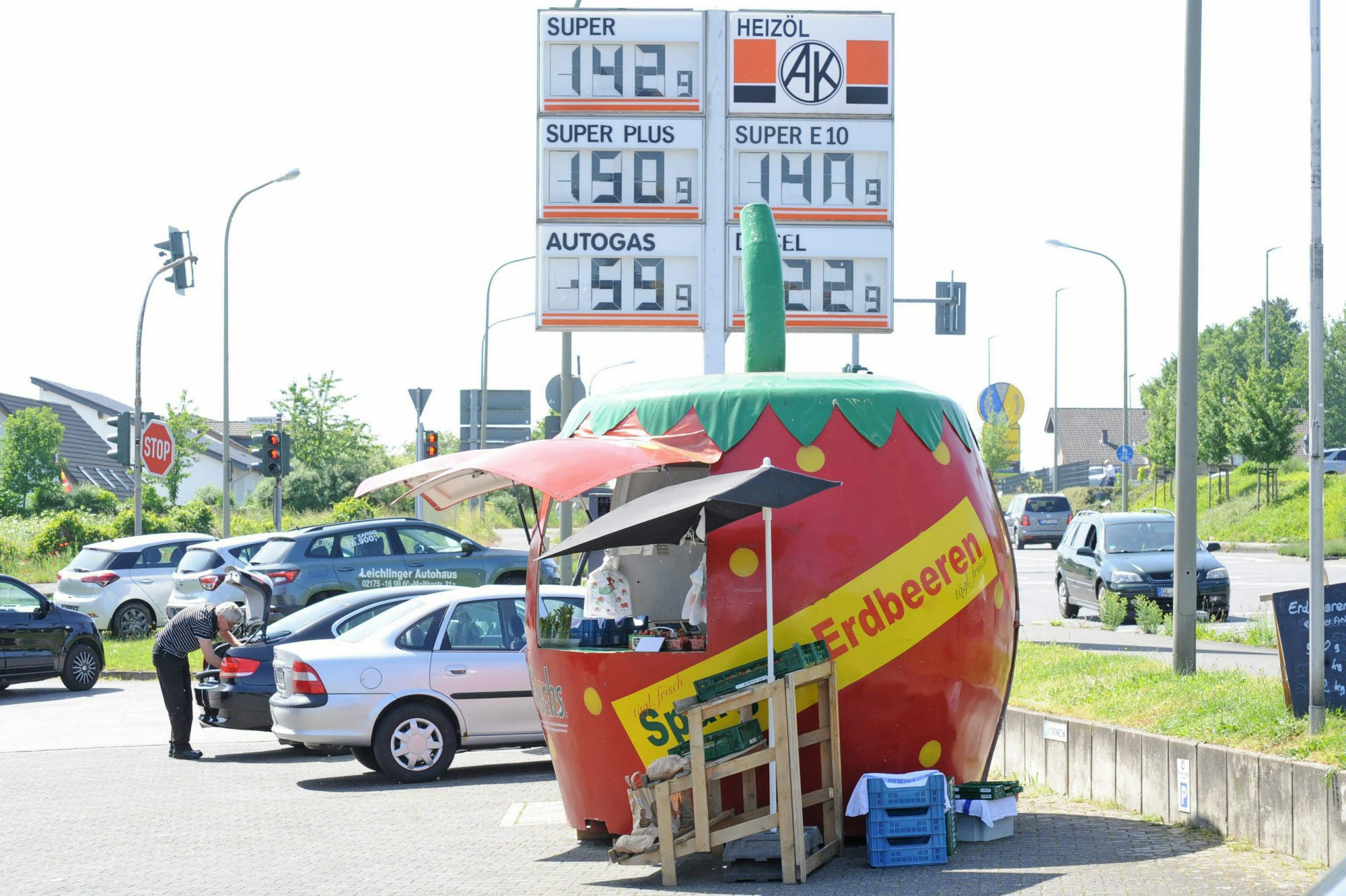 Das Erdbeergeschäft hat eine eigene Architektur hervorgebracht: Mobiler Verkaufsstand an der Tankstelle an der Kreuzung Trompete.