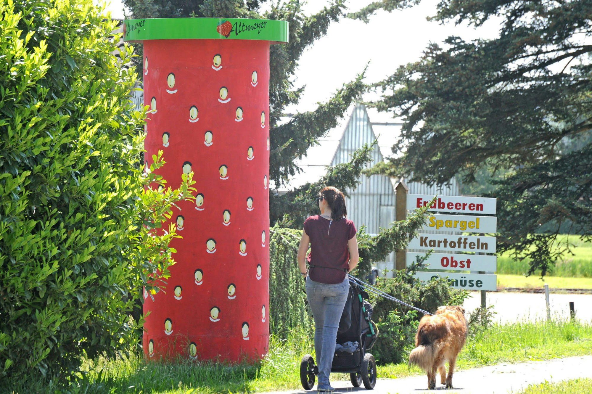 Kommt die Werbung bei Böwer nach wie vor mit einem bescheidenen Straßenschild aus, hat das Erdbeergeschäft andernorts im Laufe der Zeit eine eigene Architektur hervorgebracht – rot-grüne Verkaufs-Pavillons in Form einer Riesen-Erdbeere mit Fenstern und Türen.