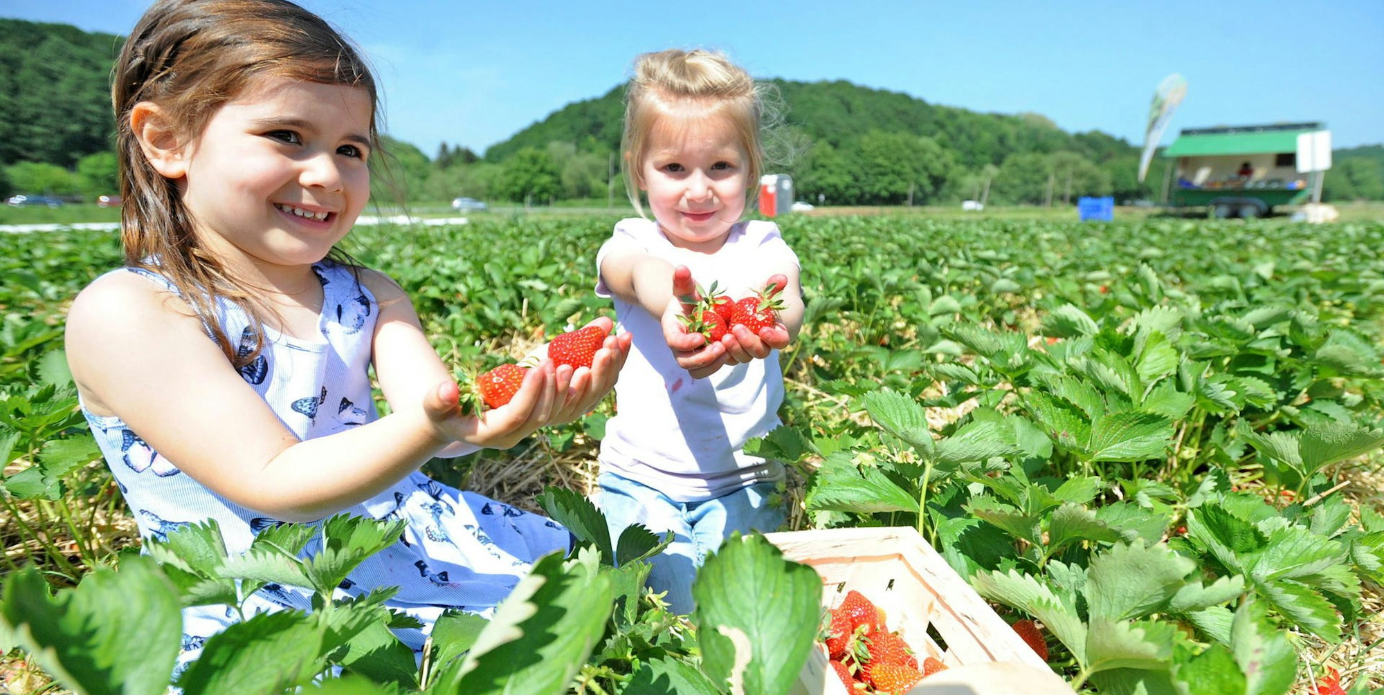 Mia und Finja, beide drei Jahre alt, beim Erdbeerpflücken auf dem Selbstbedienungs-Feld von Gut Nesselrath.