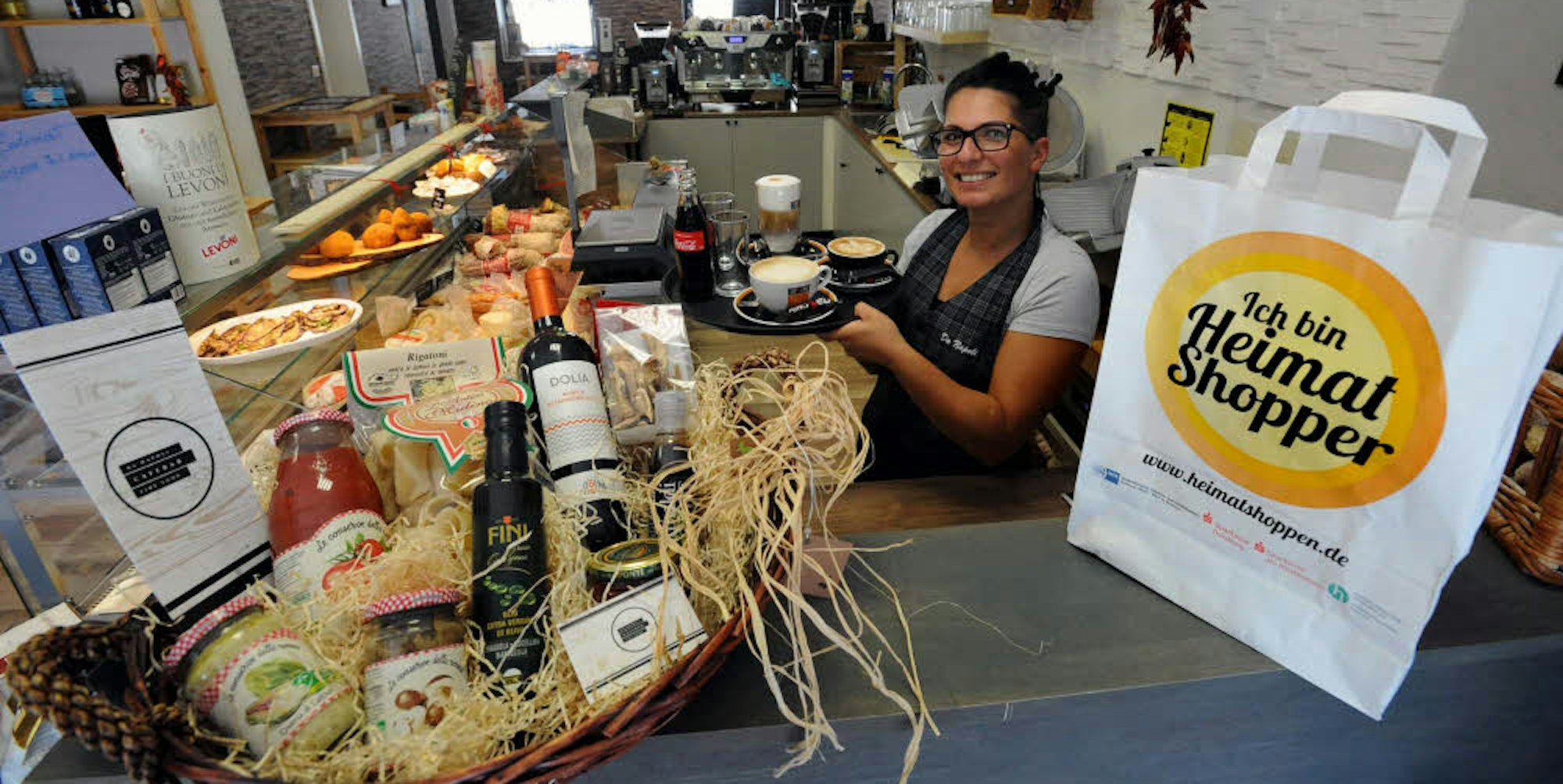 3000 Tragetaschen mit dem Logo von „Heimatshoppen“ sind im Umlauf, hier bei Feinkosthändlerin Rossana Napoli.