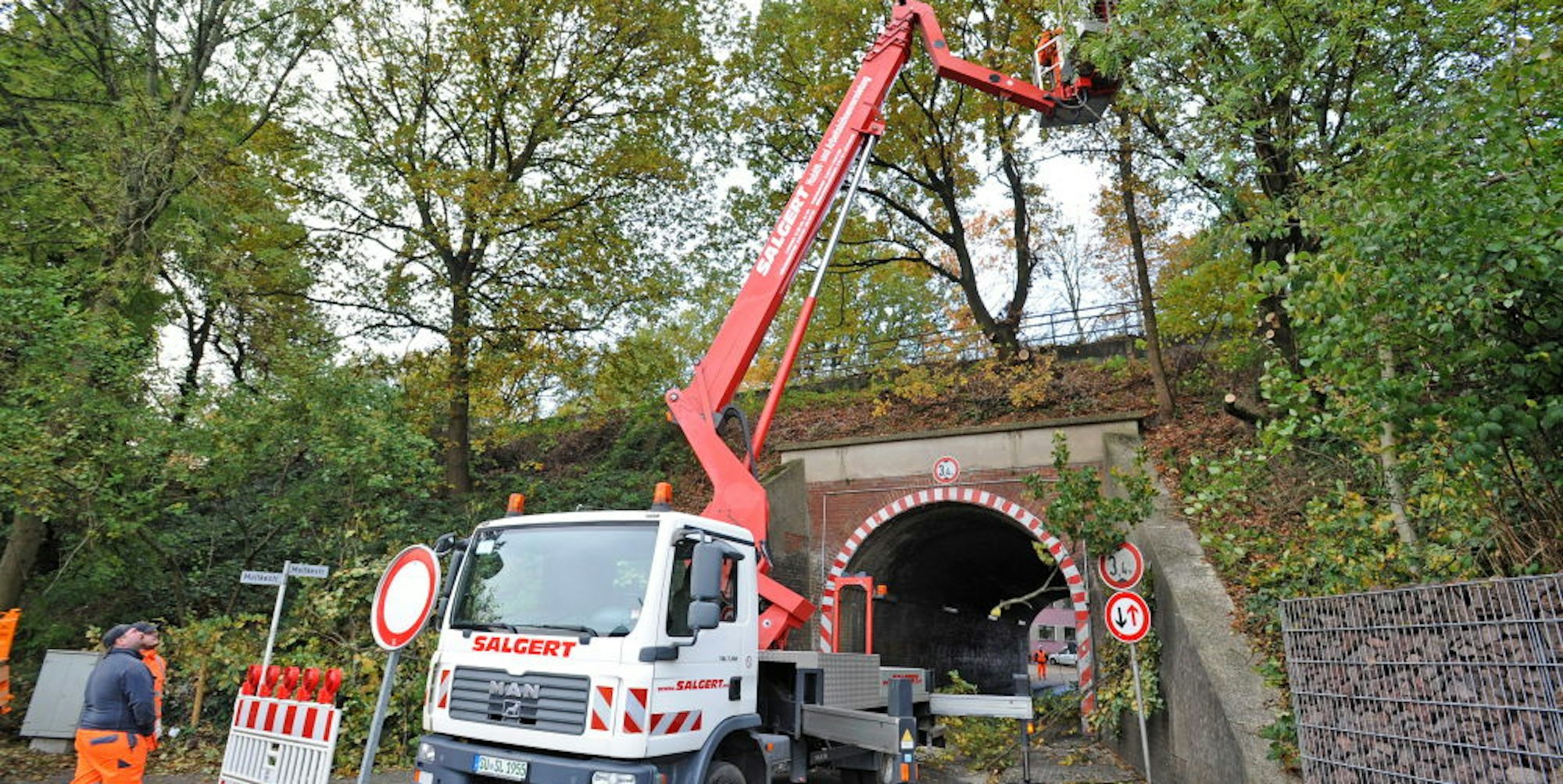Schon um 9.15 Uhr waren die ersten Äste abgesägt und landeten krachend auf der Straße. Später kam ein Hubsteiger zum Einsatz, von dessen Ausleger aus die Bäume bearbeitet wurden. Die Unterführung bleibt wegen der Rodungen und Instandsetzungsarbeiten voraussichtlich bis Freitag täglich zwischen 9 und 15 Uhr gesperrt.