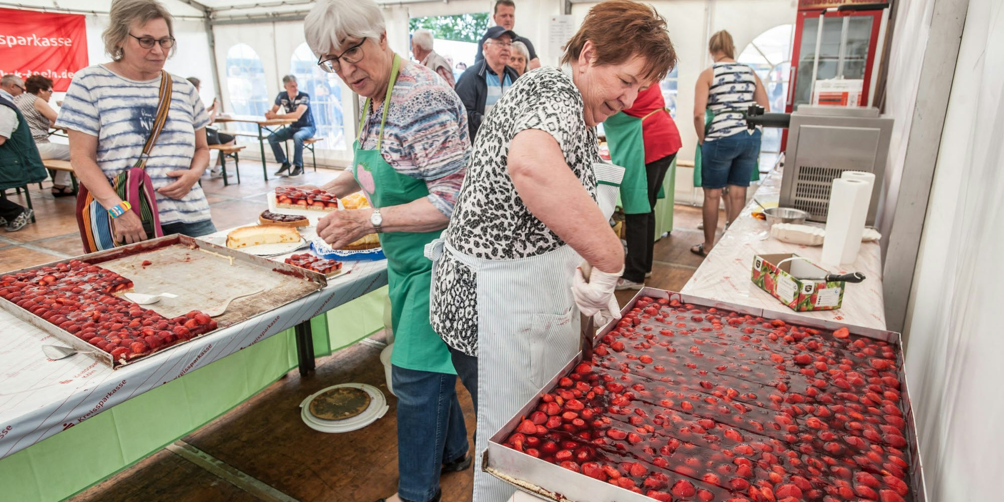 Wem es beim Fest für Wein zu früh war, konnte den Nachmittag aber natürlich auch bei Kaffee und Erdbeerkuchen genießen: Zwanzig große Bleche Erdbeerkuchen backten die Schützenschwestern, jeweils mit sechs Kilogramm Erdbeeren belegt. Das Geheimnis für einen guten Erdbeerkuchen sei: Viel Liebe. So wie bei allem im Leben, erklärten die Bäckerinnen.