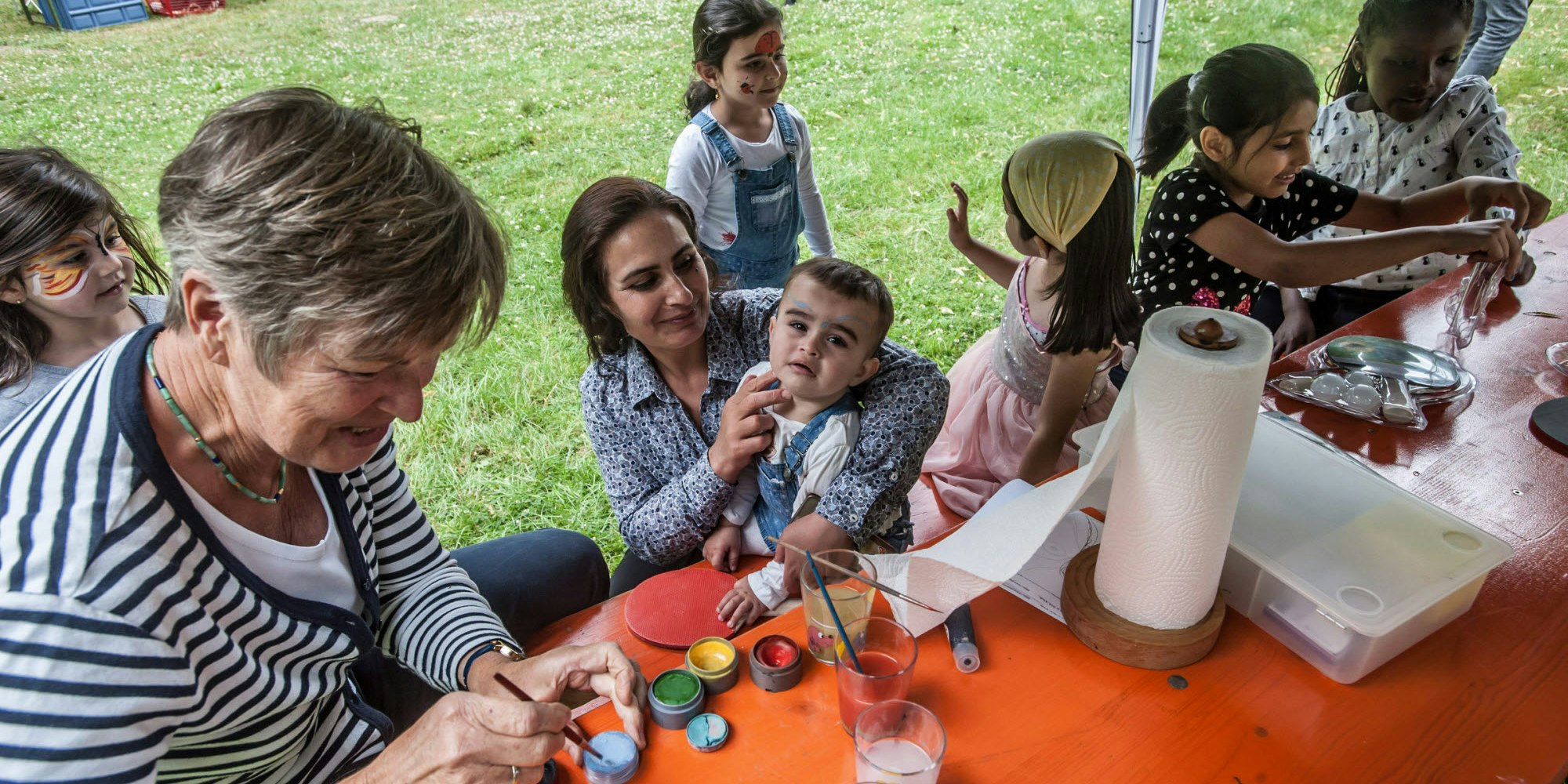 Die Aktionen variierten vom Eierlaufen über das Werfen von Murmeln bis hin zum Balancieren auf einer Slack-Line. „Die Spieler einer Gruppe haben für eine Aufgabe zehn Minuten Zeit und können dabei gemeinsam Punkte für die Gruppe sammeln“, stellte der Sozialpädagoge Jan Hermes vor. Am Ende wurden die Punkte zusammen gerechnet, wer die meisten hatte, gewann. Neben dem Migrationstag organisieren die rund 20 Mitarbeiter auch regelmäßige Willkommenstreffs und Migrationscafés. Dabei haben die Bemühungen des Ökumenischen Arbeitskreises in Leichlingen bereits positive Rückmeldungen bekommen. „Durch unsere offenen Angebote für alle Leichlinger Bürger können wir unsere Flüchtlinge erfolgreich in Vereine und in die Gemeinschaft eingliedern“, sagte Susanne Kornatz als derzeit pausierende Mitarbeiterin. Sie war bisher für die Kinderaktionen auf dem Migrationstag zuständig. Denn zusätzlich zu dem Spiel ohne Grenzen gab es für die Kleinen kreative Angebote. So war der Pavillon für das Kinderschminken direkt zu Beginn des Festes gut gefüllt. Doch auch die Hüpfburg und die Fingerfarben waren beliebt, denn jeder Besucher durfte sich auf dem Plakat mit seinem Fingerabdruck in der Lieblingsfarbe verewigen.