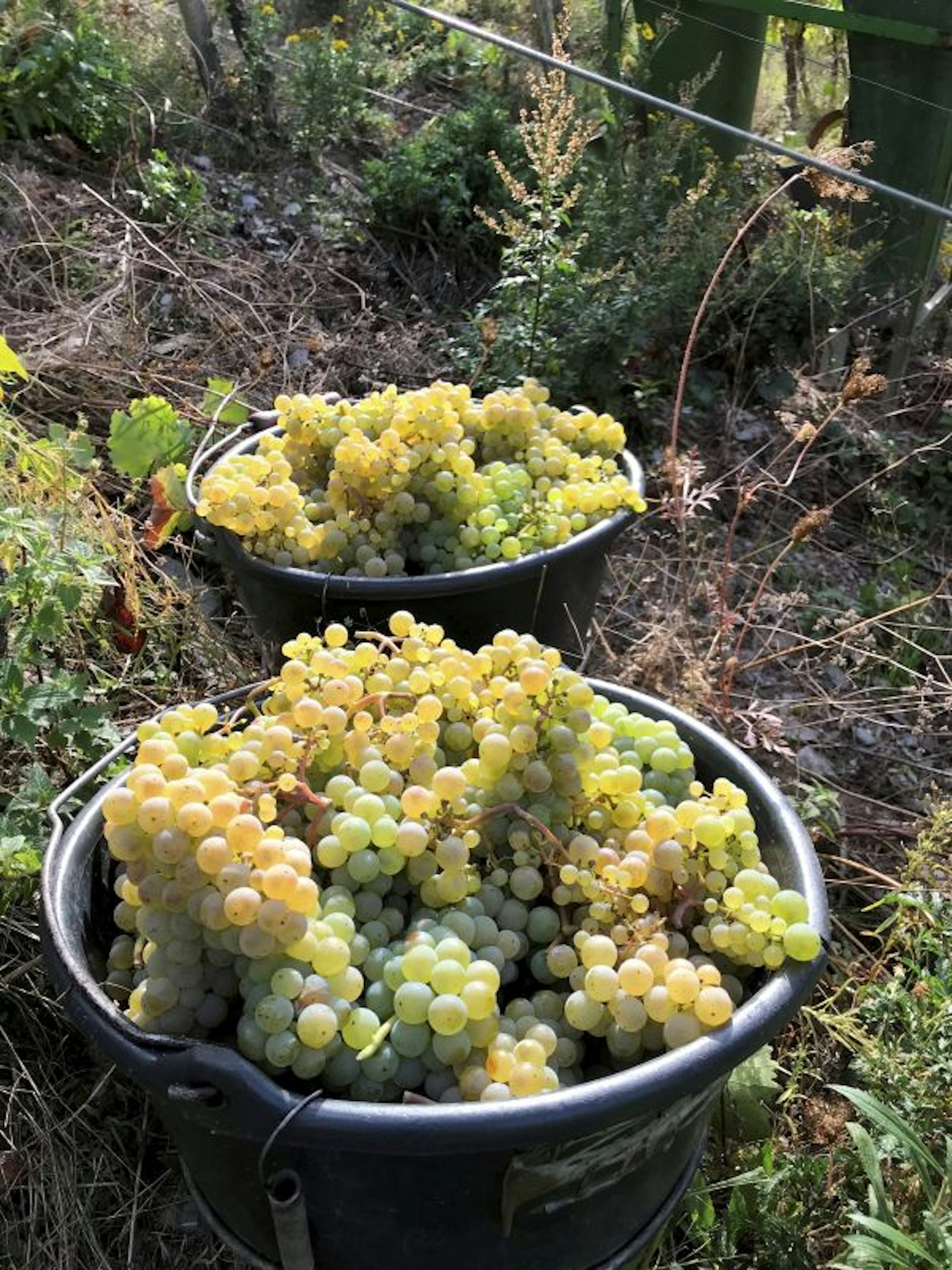 In Bottichen werden die Weintrauben gesammelt und dann zum Winzer gebracht.