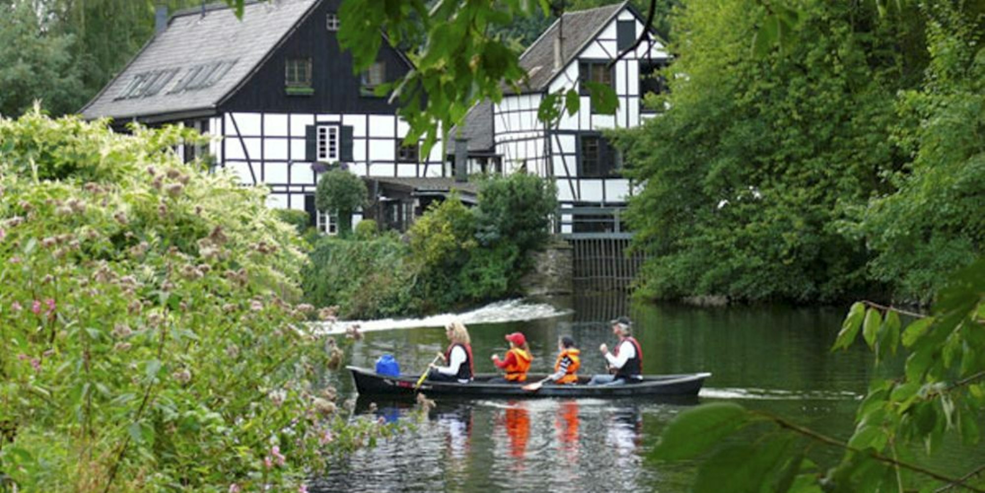Als Familie oder zu zweit darf man auf der Wupper in Leichlingen (hier vor dem Wipperkotten) wieder Kanutouren unternehmen. Guides achten darauf, dass Abstände und Hygiene-Regeln eingehalten werden.
