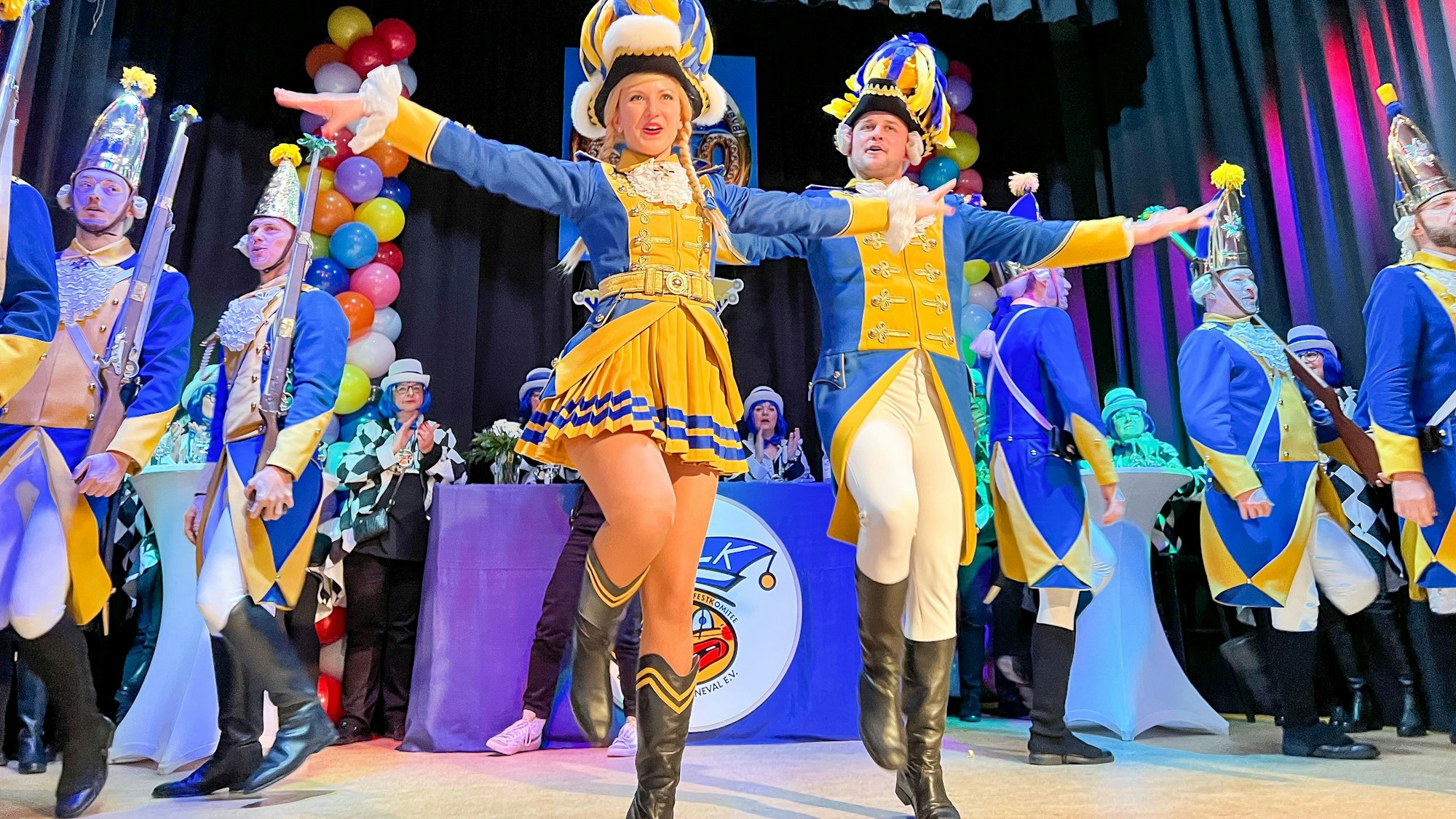 Größere Hürden oder Probleme bei der Organisation und Programmgestaltung habe es ihr nach nicht gegeben. Die Stadthalle sei nahezu ausverkauft: „Die Leichlingerinnen haben wohl nur darauf gewartet, endlich wieder mit uns zu feiern.“ Das ist im Raum sofort zu spüren, als die Bürgergarde Blau-Gold Einmarsch erhält. Keine hält es mehr auf den Stühlen, als das Kölner Traditionskorps mit dem ersten Tanz auf der Bühne beginnt. Ein so rasantes blau-goldenes Bewegungsfeuerwerk, dass der Tanzpartner vom Mariechen zwischen fliegenden Beinen und Hebefiguren zwischenzeitlich seinen Hut verliert. „Blau und jold, dat han ich schon als kleene Jung jewollt“, heißt es.